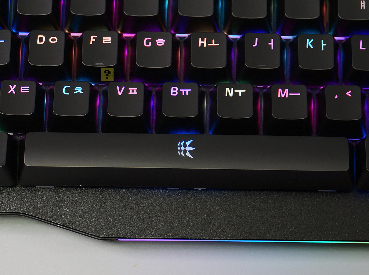 RGB LED를 지원하며 총 15가지의 RGB LED 효과를 확인할 수 있습니다. 레인보우와 단색 모드로 크게 나눌 수 있으며 밝기, 속도, 색상, 흐름 같은 효과 설정이 가능합니다. 한글, 영문 폰트가 모두 LED 투과가 되는 알 수 있으며 비티 타입 방식으로 스위치가 노출되어 있어 상판에서도 LED 효과를 확인할 수 있습니다.