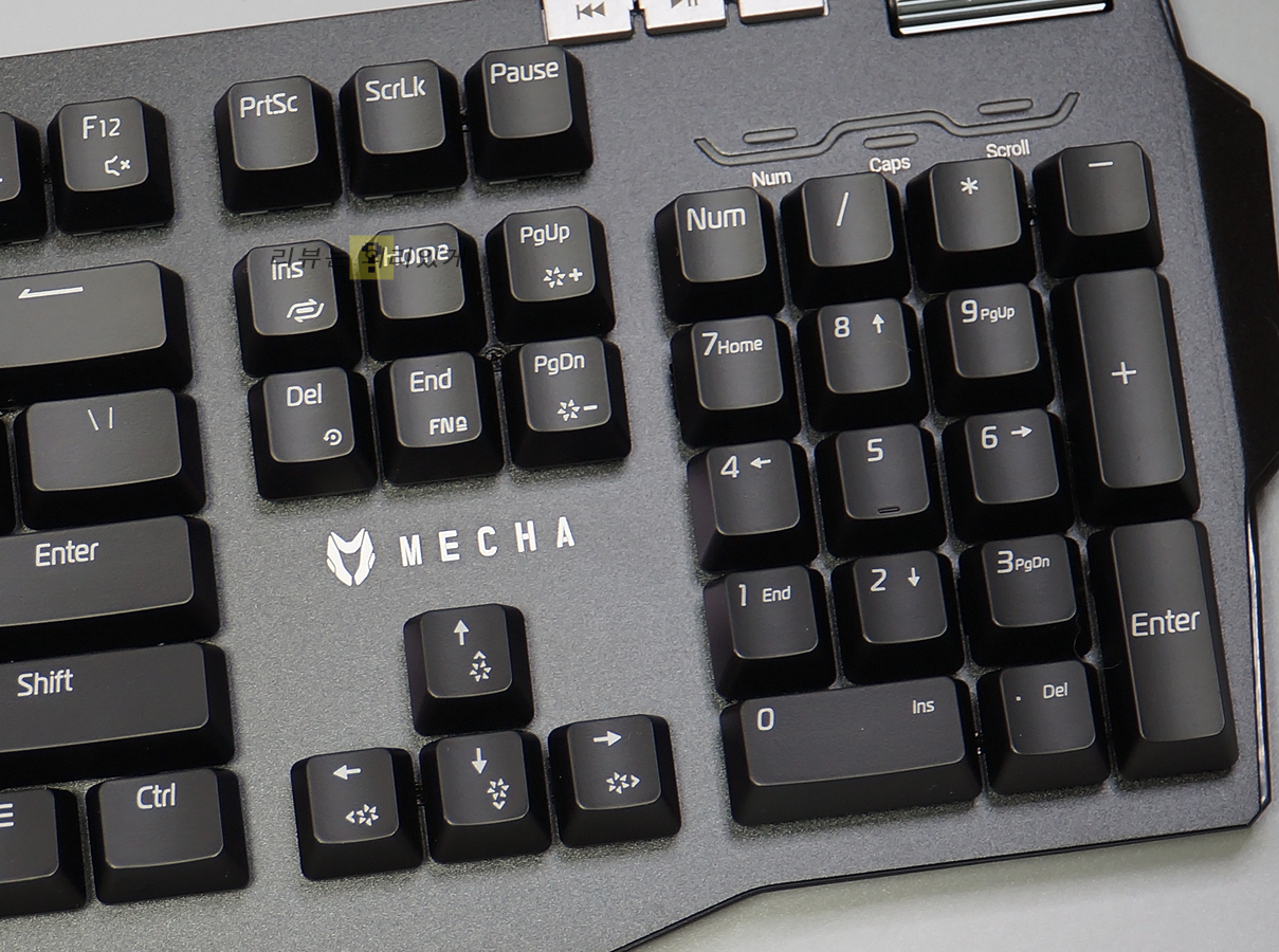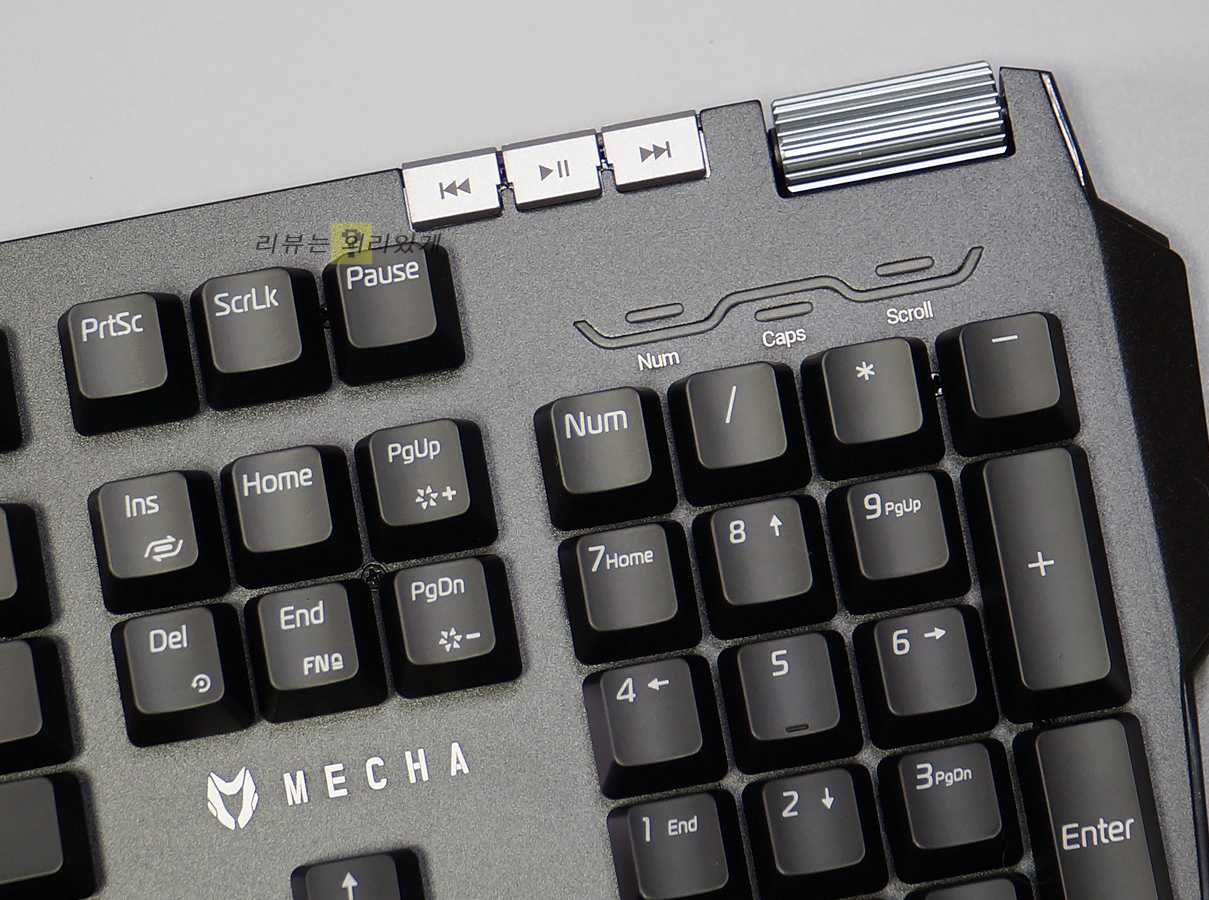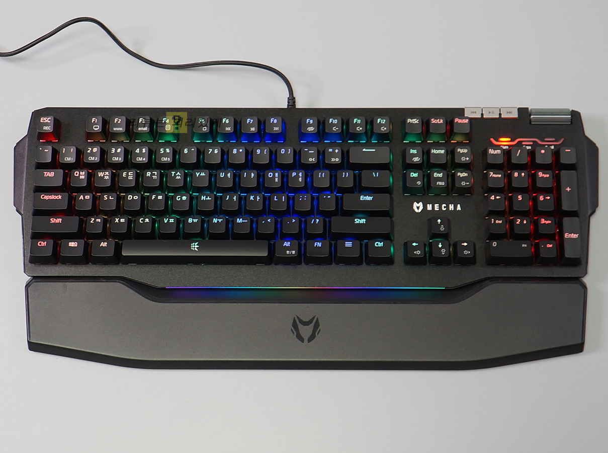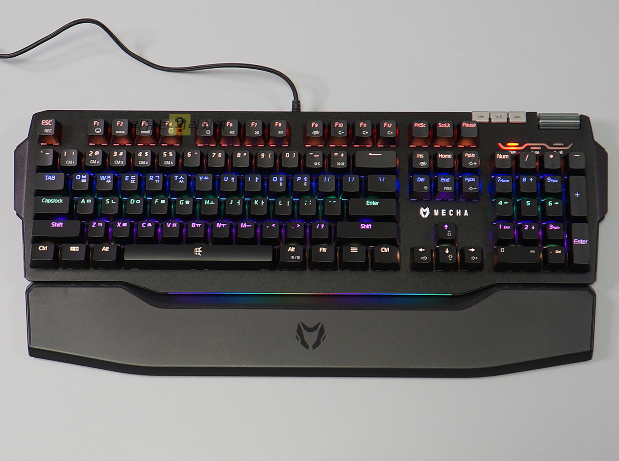 마이크로닉스의 새로운 게이밍 키보드인 마이크로닉스 MECHA ZK-1은 이전에 출시된 자사의 키보드들과 크게 차이가 없어 보이지만 팜레스트를 기본 제공하고 있다는 점에서 차별화되고 있습니다. 물론 기본 제공되는 만큼 퀄러티는 다른 기성품에 비해 좋다고 볼 수는 없지만 추가 구매를 하지 않아도 된다는 점에서 나름 메리트가 있는 편입니다. 하지만 MECHA ZK-1은 팜레스트 추가가 전부인 것은 아닙니다. 기본적으로 게이밍 키보드에 제공되는 FN 키를 활용한 멀티미디어 기능 외에 전용 버튼과 휠을 추가하여 편의성을 높여주었습니다.