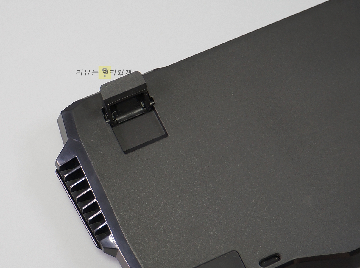 104키 키 배열 방식을 사용하며 좌, 우 각각 포인트처럼 돌출된 디자인을 확인할 수 있습니다. 키캡과 상판 모두 무광 블랙 도장 처리가 되어 있어 약간 무거운 느낌을 보여주는 편입니다.