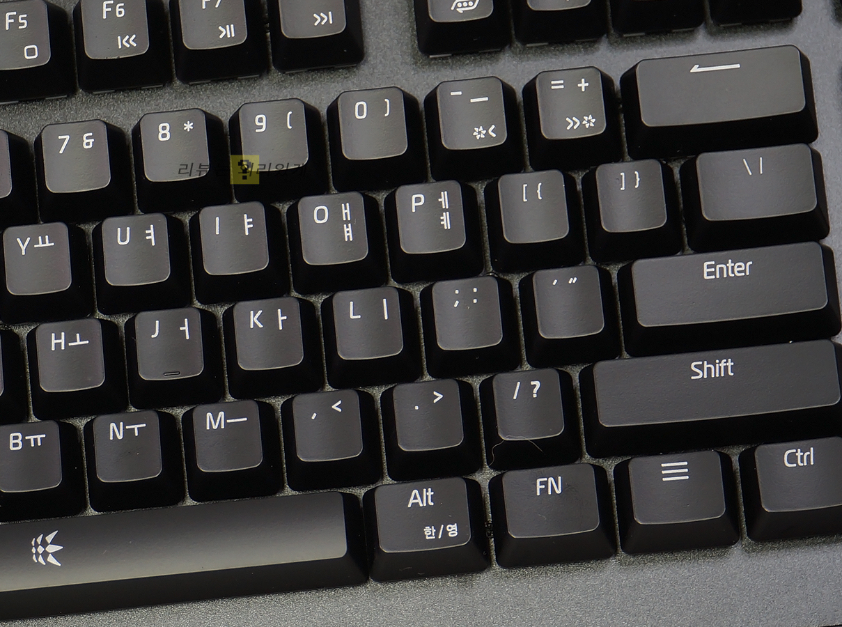 리뷰에는 카일 박스 스위치 백축이 사용되었습니다. 특유의 짤깍 거리는 키감을 확인할 수 있었으며 키압은 그렇게 무겁게 느껴지지 않았습니다. 사용자에 따라 평가가 다르겠지만 전체적으로 구분감과 부드러움을 확인할 수 있었습니다.