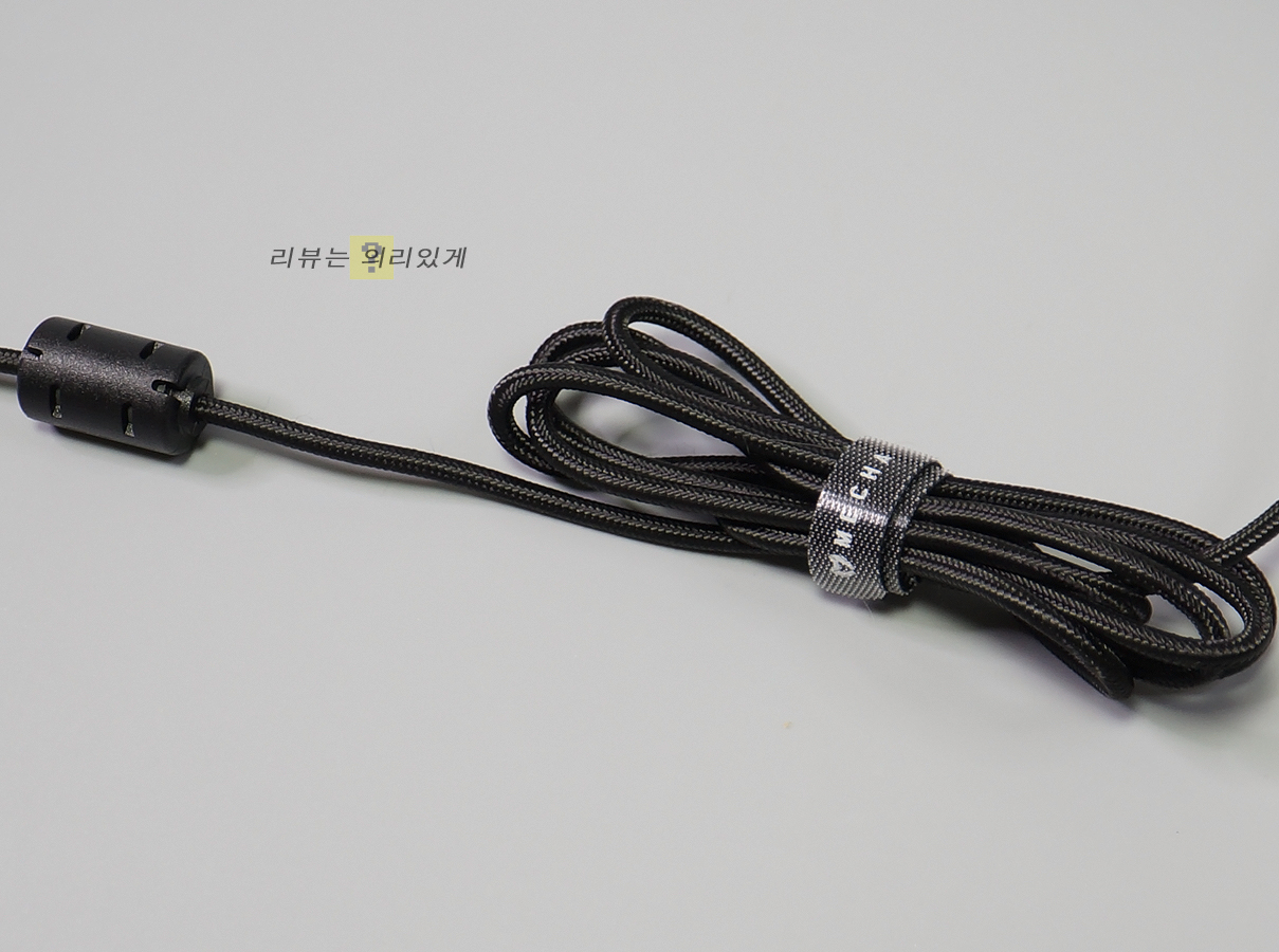 선꼬임과 단선 방지에 도움을 주는 패브릭 케이블이 적용되었으며 선 정리를 위한 벨크로 타이가 부착되어 있습니다. 중간에 노이즈 필터까지 부착되어 있는 일반적인 키보드 케이블 형태를 확인할 수 있으며 USB 포트는 금도금 처리가 되어 있지 않으며 전용 마개도 제공되지 않습니다.