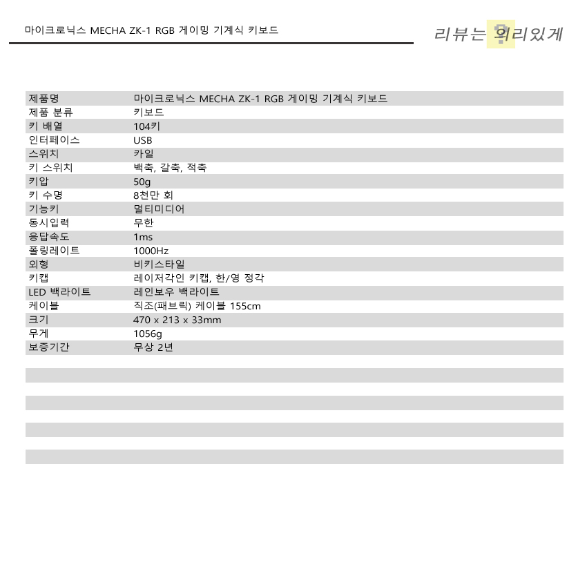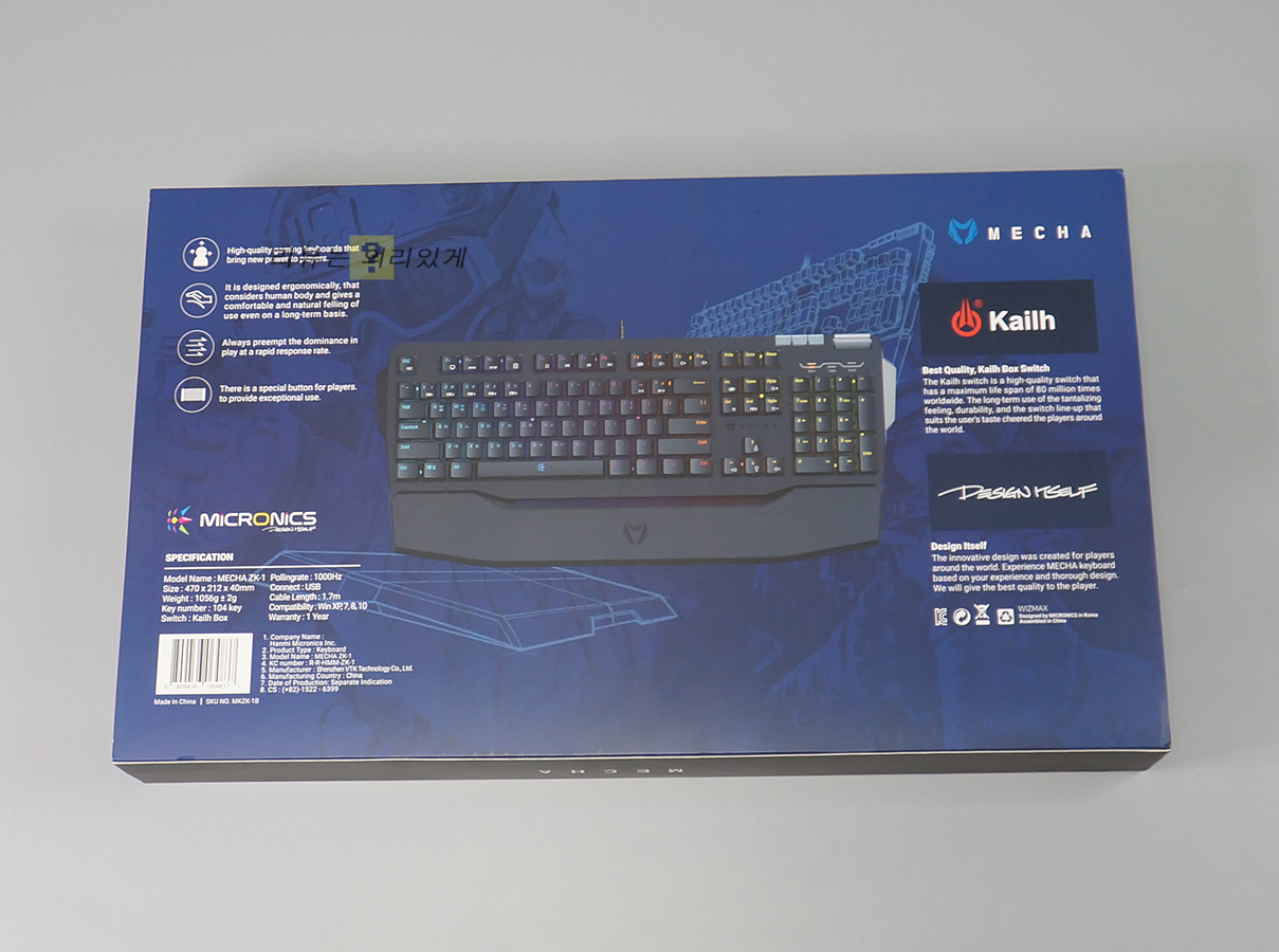 폴링 레이트는 1000Hz이며 무한 동시 입력과 윈도우 락을 지원합니다. 제품 크기는 470 x 213 x 33mm이며 무게는 약 1056g입니다.