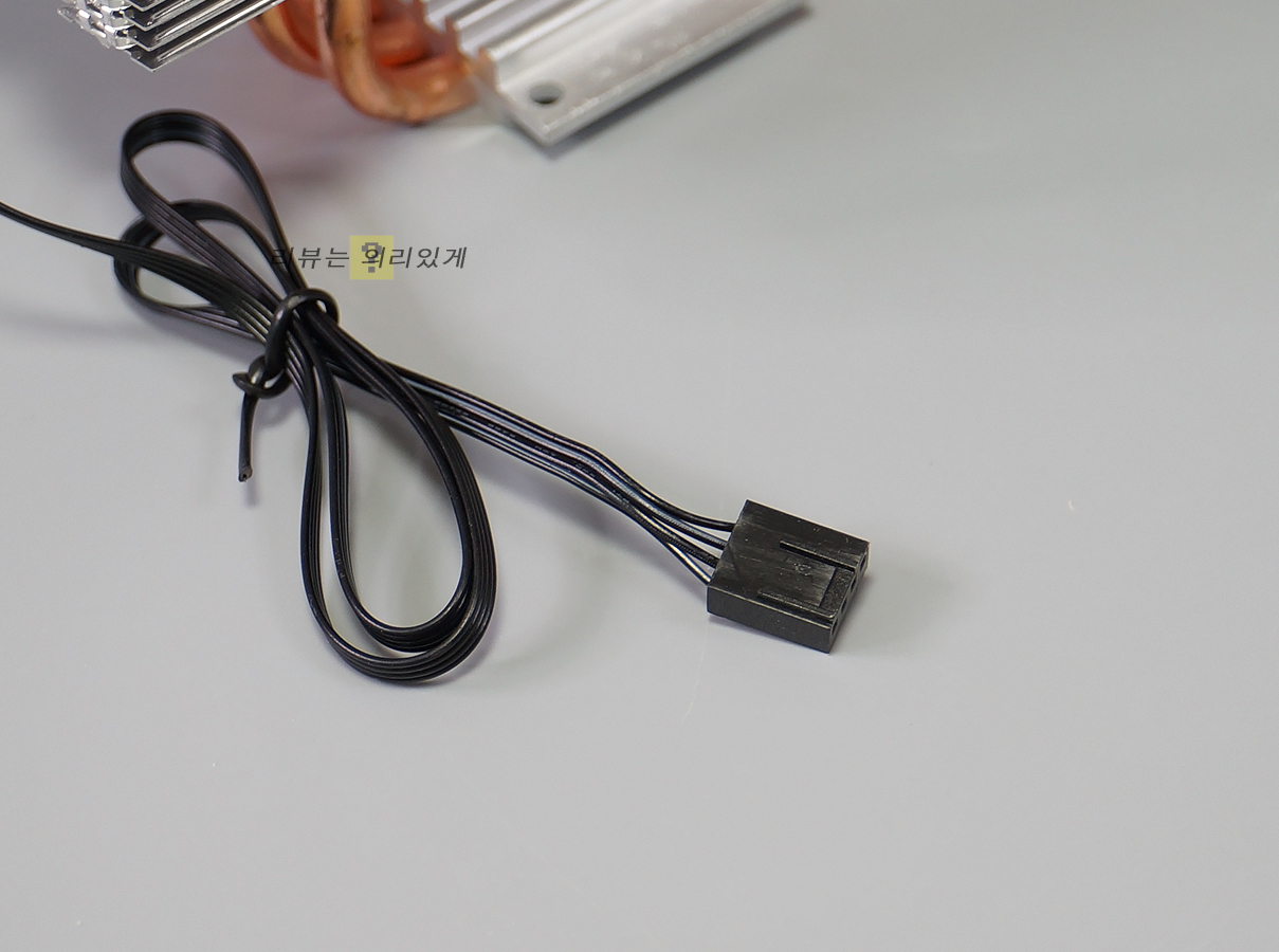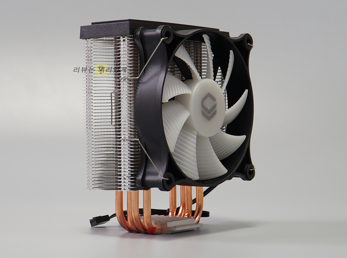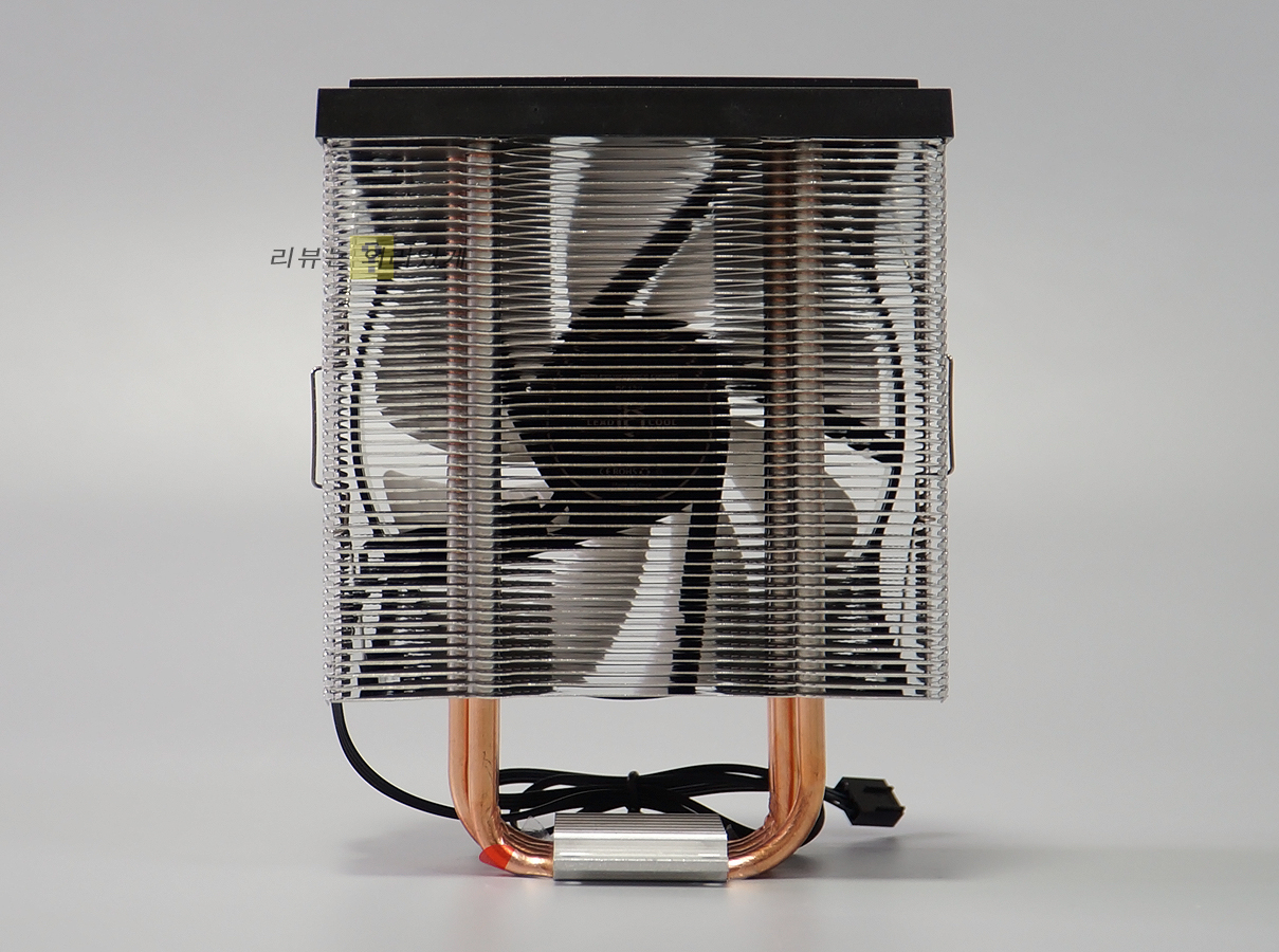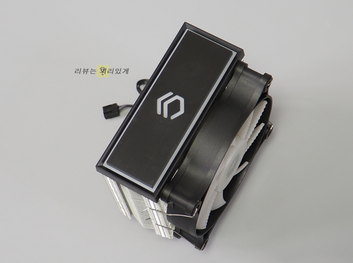 일반적인 타워형 쿨러 형태로 클립을 사용하여 고정시키는 방식을 사용합니다. 120mm LED 팬 1개를 사용하며 상단 커버를 적용한 마감 처리를 확인할 수 있습니다.