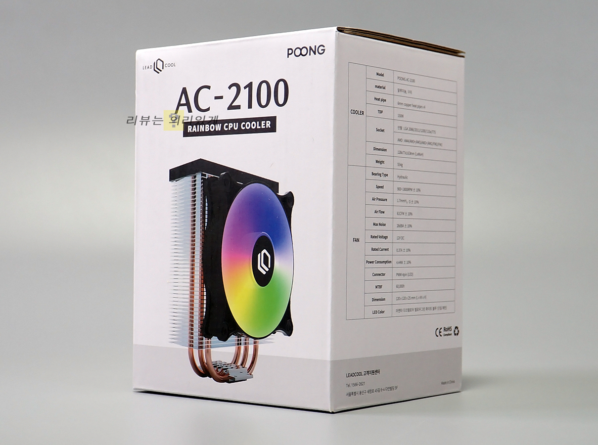LEADCOOL POONG AC-2100 RAINBOW는 AC-3100과 더불어 출시된 CPU 쿨러로서 AC-3100과 달리 ARGB, 커버 LED가 제외된 제품입니다. 그만큼 가격이 저렴해졌다는 장점도 있지만 각 제품 간 가격차가 약 5,000원 정도로 크지 않습니다. LED 효과를 제외하면 동일한 성능을 보여주기 때문에 조금이라도 저렴한 제품을 선택하고자 한다면 AC-2100을 사용하는 것이 좋을 것입니다.