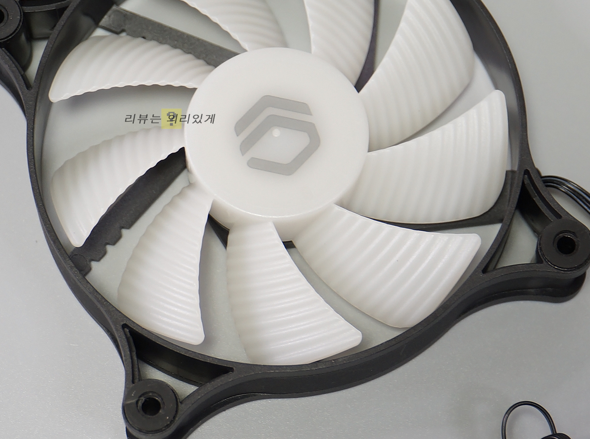 쿨링팬은 무난한 블랙 색상에 굴곡이 있는 화이트 팬이 사용되었습니다. AC-2100은 색상이 고정되어 있어 4핀 컨텍터 1개만 제공됩니다. PWM 컨트롤을 지원하여 CPU 온도에 따라 900 ~ 1800 RPM(±10%)까지 작동하며 진동 방지 고무패드가 부착되어 있습니다.
