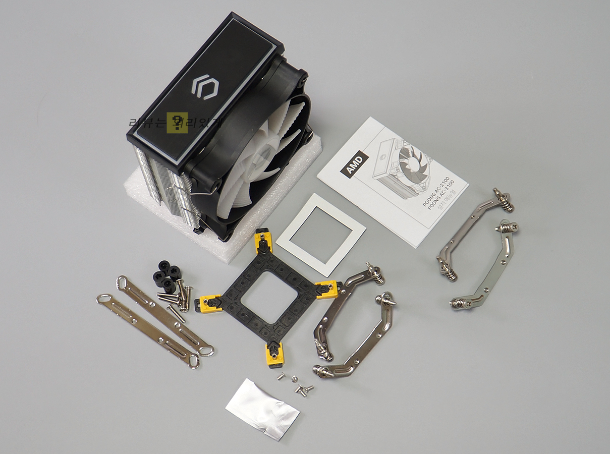제품은 스티로폼으로 보호하고 있으며 인텔 호환 소켓 부품류(백플레이트 포함), AMD 호환 소켓 부품류, 써멀 컴파운드, 설명서가 구성품으로 제공됩니다.