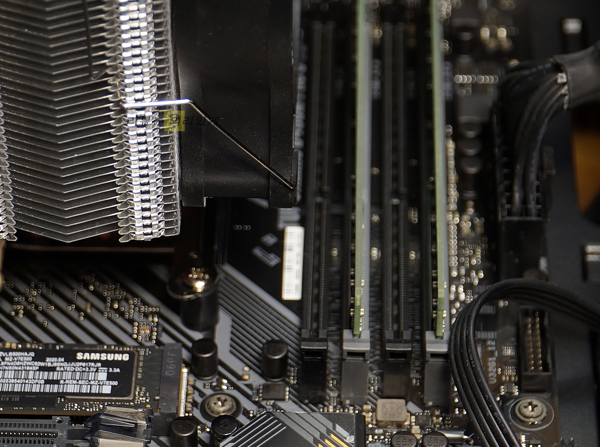 RAM 슬롯과 쿨링팬과의 간섭은 발생하지 않았습니다. 방열판이 포함된 튜닝 램을 사용하여도 간섭 문제가 없을 것으로 생각됩니다.
