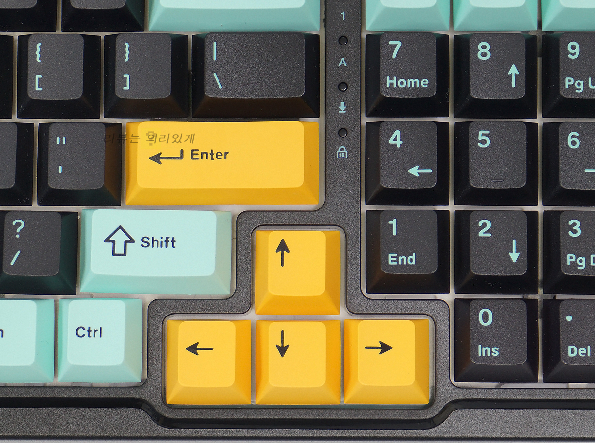 엔터키는 -자형 방식을 사용하고 있으며 우측 시프트는 방향키 위치로 인해 조금 작은 편입니다. 방향키는 약간 아래에 위치해 있으며 상태 표시등이 그 위에 부착되어 있습니다.