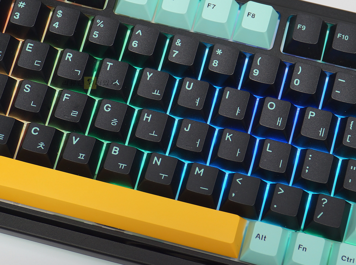 상판이 블랙 색상을 사용한 것과 달리 블랙, 옐로우, 민트 3가지 색상의 키캡이 사용되었습니다. 모서리를 둥글게 마감하였으며 볼륨 조절과 조명 효과 제어를 위한 노브를 추가하였습니다. 숫자 키패드가 포함된 풀배열 방식을 사용하고 있으며 키 배열은 99키입니다. 케이블 분리형 방식 때문에 유선 외에 무선도 지원하는 것처럼 보이지만 케이블 연결을 통한 유선 사용만 가능합니다.