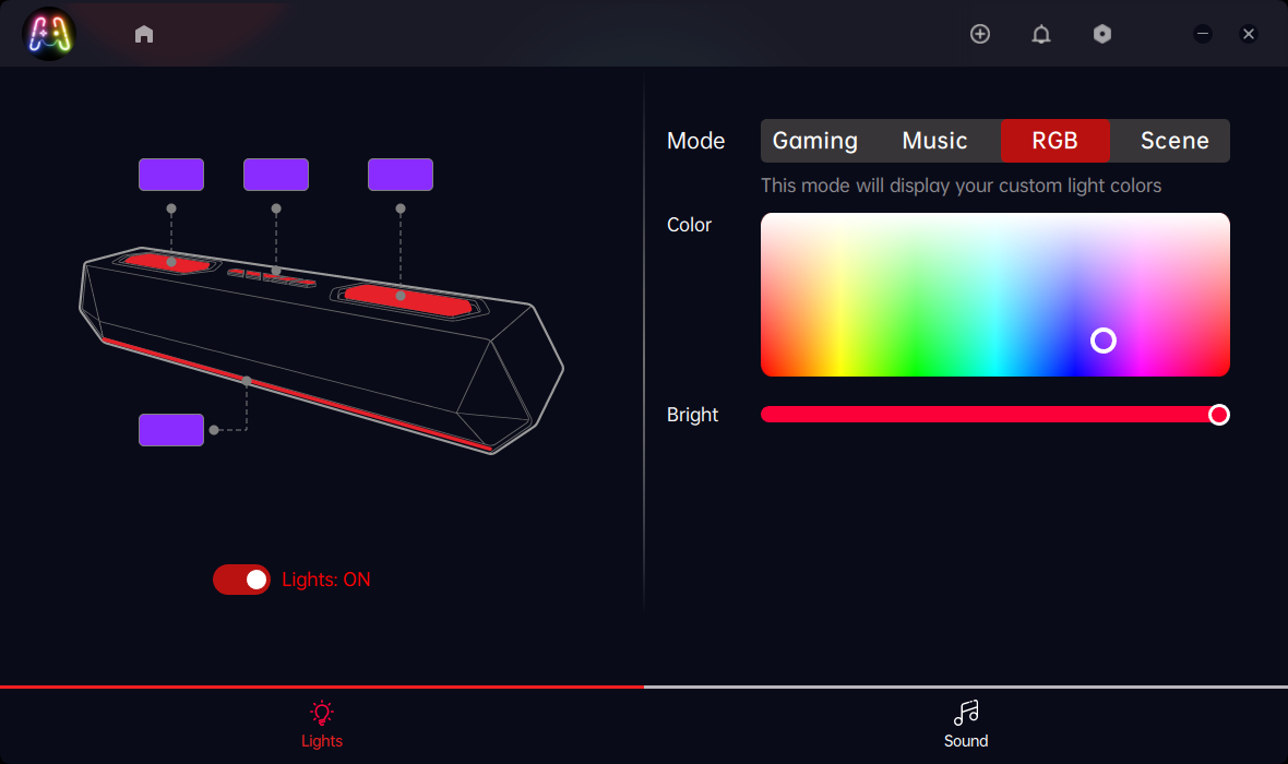 사운드 모드는 게이밍, 음악, RGB, 장면으로 총 4가지로 분류되고 있으며 각 옵션에 맞게 변경할 수 있습니다. 이를 사용해 색상 또는 모드, 밝기와 같은 다양한 변경을 진행할 수 있으며 필요하지 않다면 끄는 것도 가능합니다.
