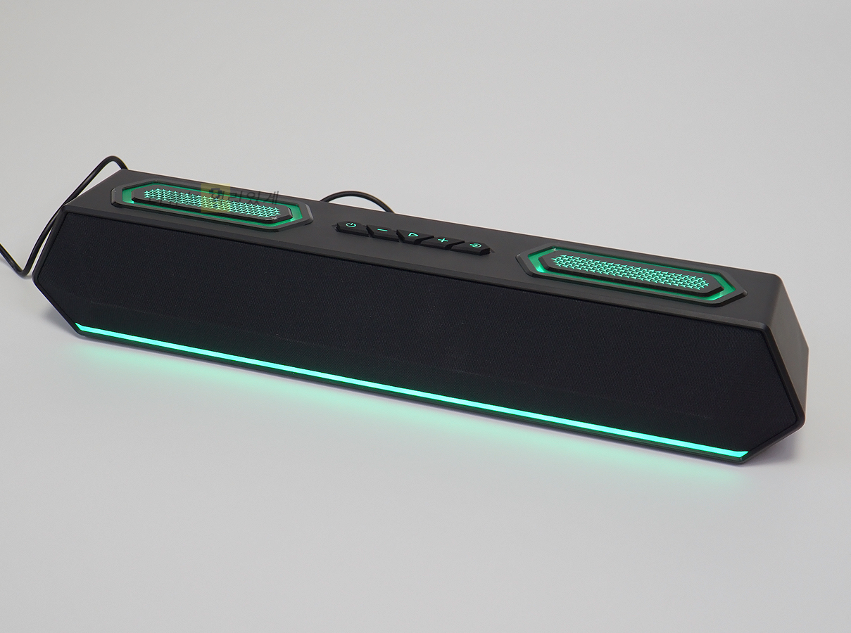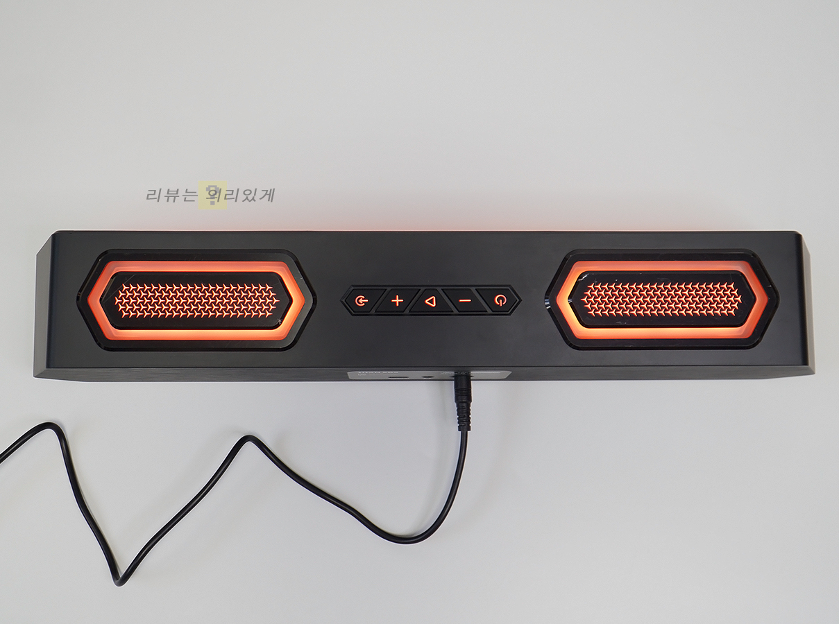 상단에는 20W 우퍼 2개와 조작 버튼이 부착되어 있습니다. 버튼은 실리콘 소재가 사용되었으며 전원, 볼륨, 재생, 페어링과 같은 기능을 지원합니다. 기본적으로 컴퓨터 사용을 염두에 두고 있으나 블루투스 v5.3을 지원합니다.