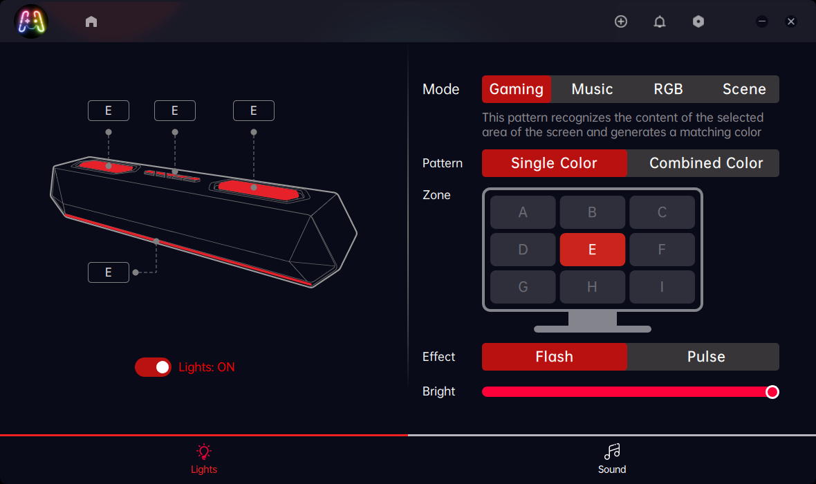 소프트웨어는 조명과 사운드 두 메뉴로 구분되며 각 메뉴에서 세분화된 설정을 변경할 수 있습니다.