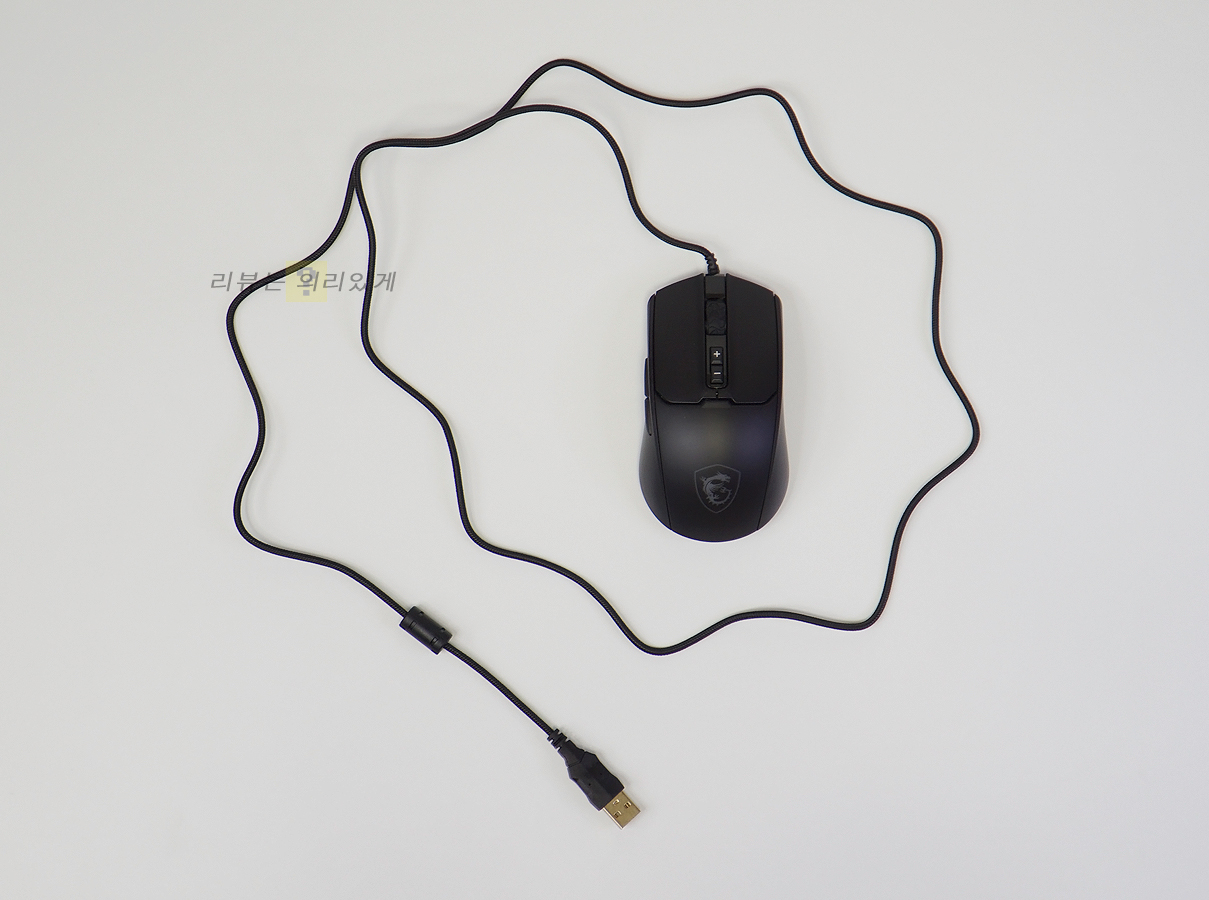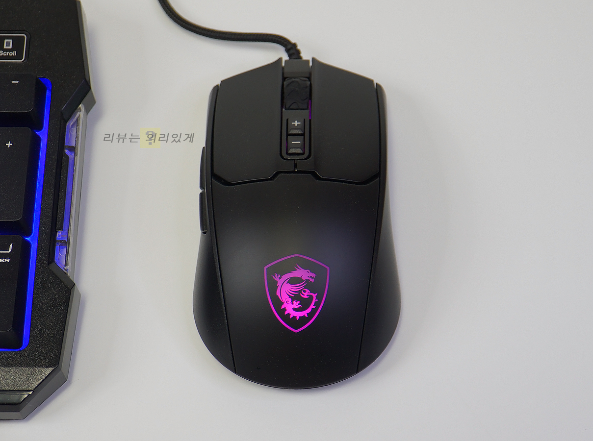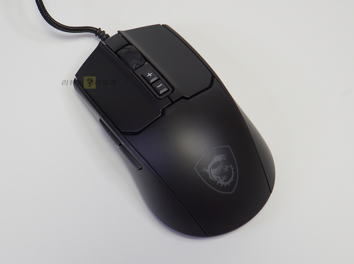 버튼은 DPI를 포함하여 7버튼이 부착되어 있으며 휠 버튼에는 미끄럼 방지를 위해 곡선형 패턴 무늬가 추가되었습니다. 뒤쪽에는 msi 로고가 각인되어 있습니다.