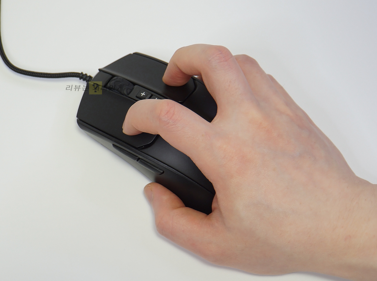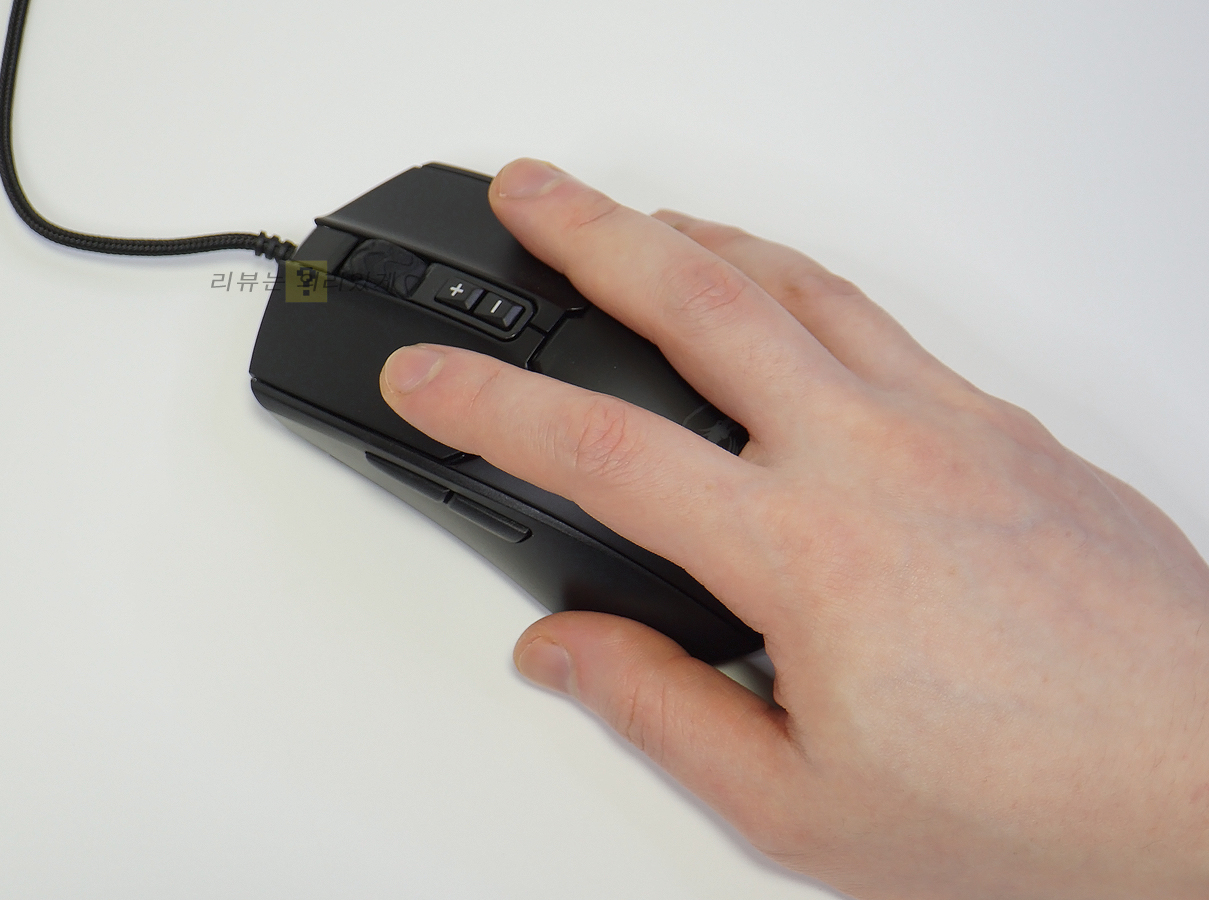 측면 기능 버튼을 생각하지 않으면 대칭형 디자인은 오른손같이 특정 손만 사용하는 것이 아니라 왼손도 사용할 수 있는데, 주로 클로 그립과 핑커 그립에 적합하다는 의견이 있으나 상품 정보에서 언급하듯 인체공학적 디자인이 적용되어 어떤 그립 방식에도 적당히 사용할 수 있습니다.