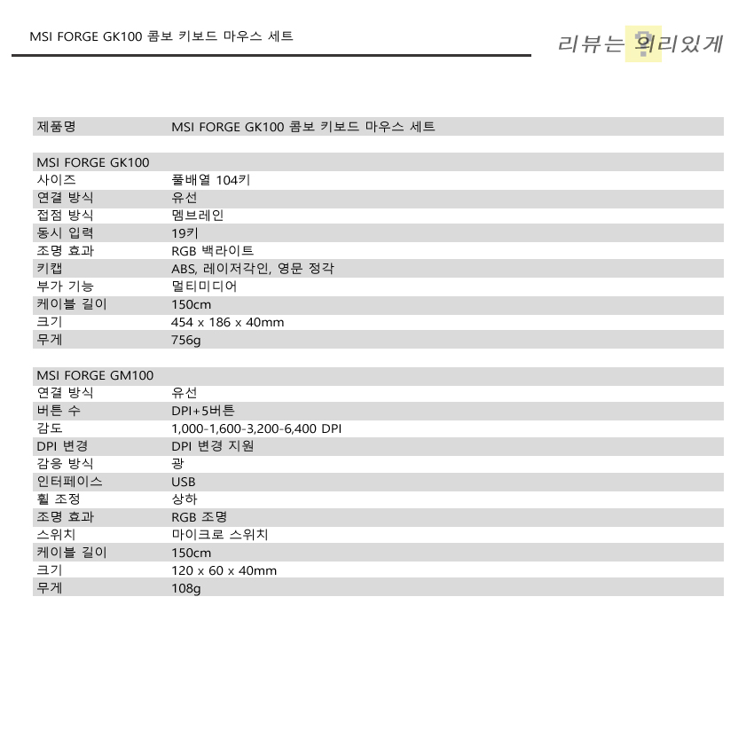 키보드와 마우스를 별도 구매하는 경우 내가 원하는 제품을 선택할 수 있다는 장점이 있지만 어떤 것을 구매해야 할지 쉽사리 결정하지 못한다면 차라리 세트로 출시되는 모델을 고려해 보는 것도 좋을 것입니다. 실제로 MSI FORGE GK100와 MSI FORGE GM100로 따로 판매가 되고 있는데 이것을 콤보 세트로 구매하면 택배비 정도를 절약할 수 있습니다.