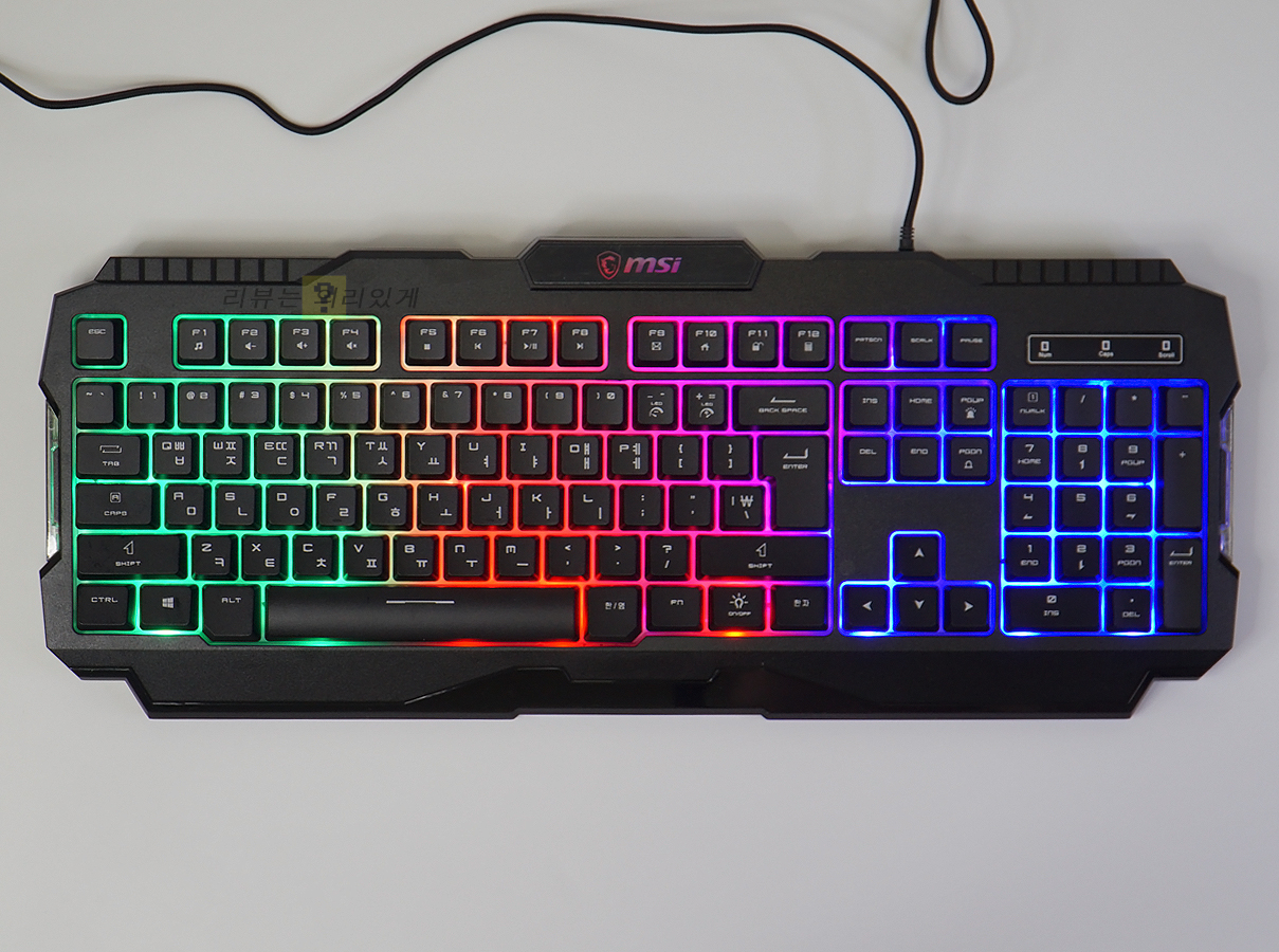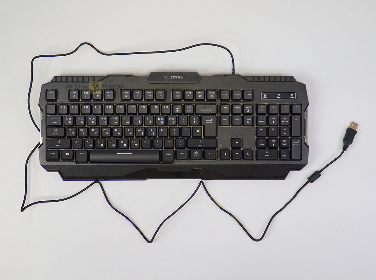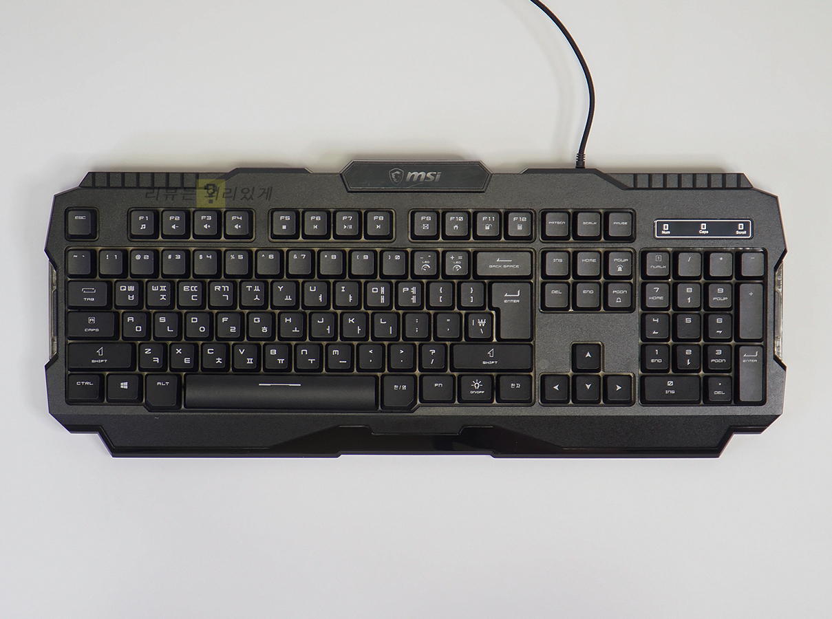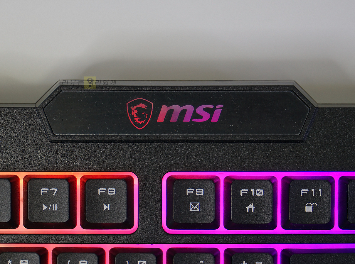 키보드는 MSI FORGE GK100라는 모델명으로 따로 판매되고 있습니다. 모서리와 하단의 유광 디자인이 특징이며 상단 중앙에는 msi 로고가 추가되었는데, 이러한 디자인은 대략 10여 년 전 즈음 볼 수 있었던 스타일로 지금은 심플함이 대세이므로 돌출된 하우징으로 인한 호불호도 생각해야 합니다.