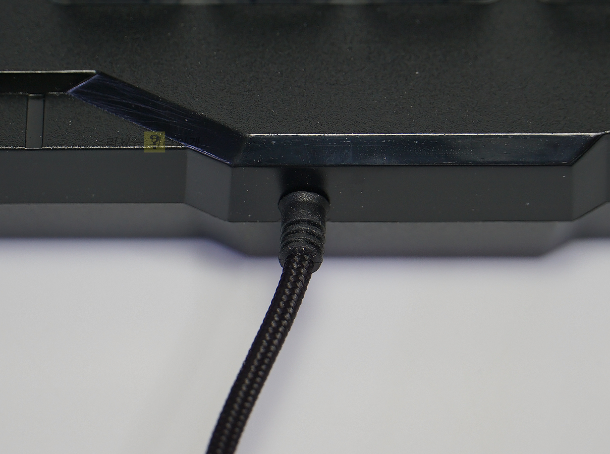 케이블은 키보드 우측에 치우친 상태로 연결되어 있으며 내구성 강화를 위해 커버가 추가되었습니다. 또한 단선 및 선 꼬임 방지를 위한 패브릭 소재가 사용되었으며 노이즈 필터가 부착되어 있습니다. USB 커넥터는 금 도금 처리하였습니다.