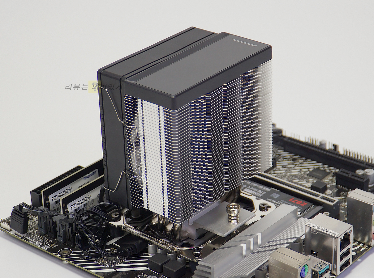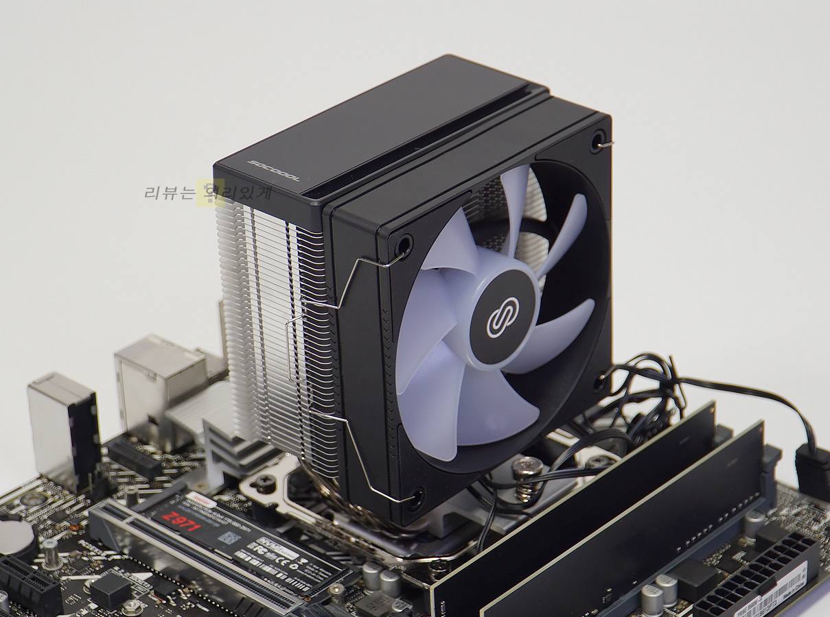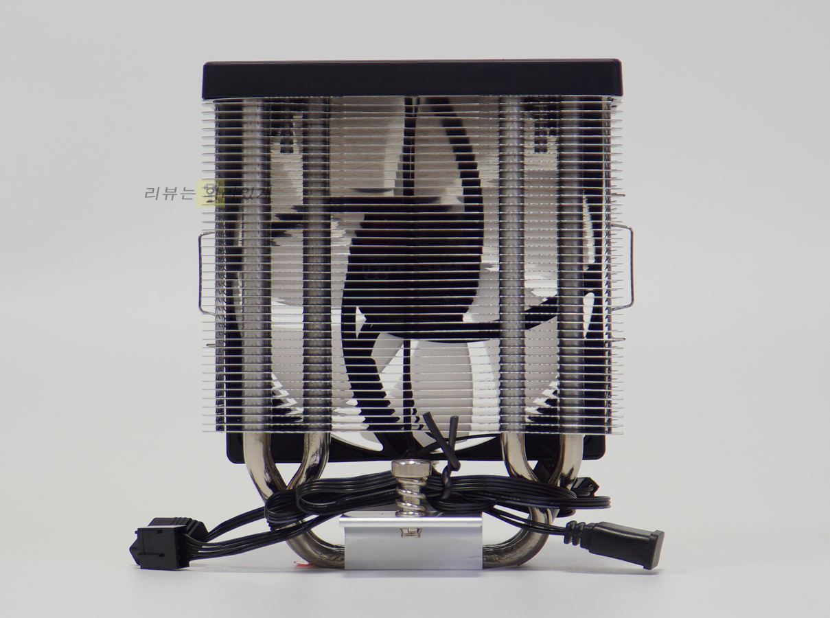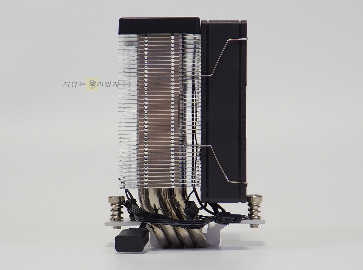 히트파이프가 뒤로 당겨진 듯한 디자인 덕분에 팬을 장착한 상태에서도 조립이 가능합니다.