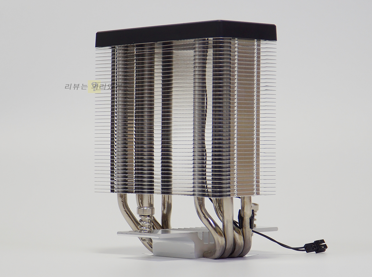 히트파이프는 니켈 도금 처리를 한 6mm 4개를 사용하였습니다. 베이스 보호와 이물질 유입을 줄이기 위해 보호필름을 부착하였기 때문에 조립 전 제거해야 합니다. 베이스는 CPU 스프레더와 히트파이프가 직접 맞닿는 HDT 방식이 사용되었으며 히트파이프는 일정 간격으로 부착되어 있습니다.