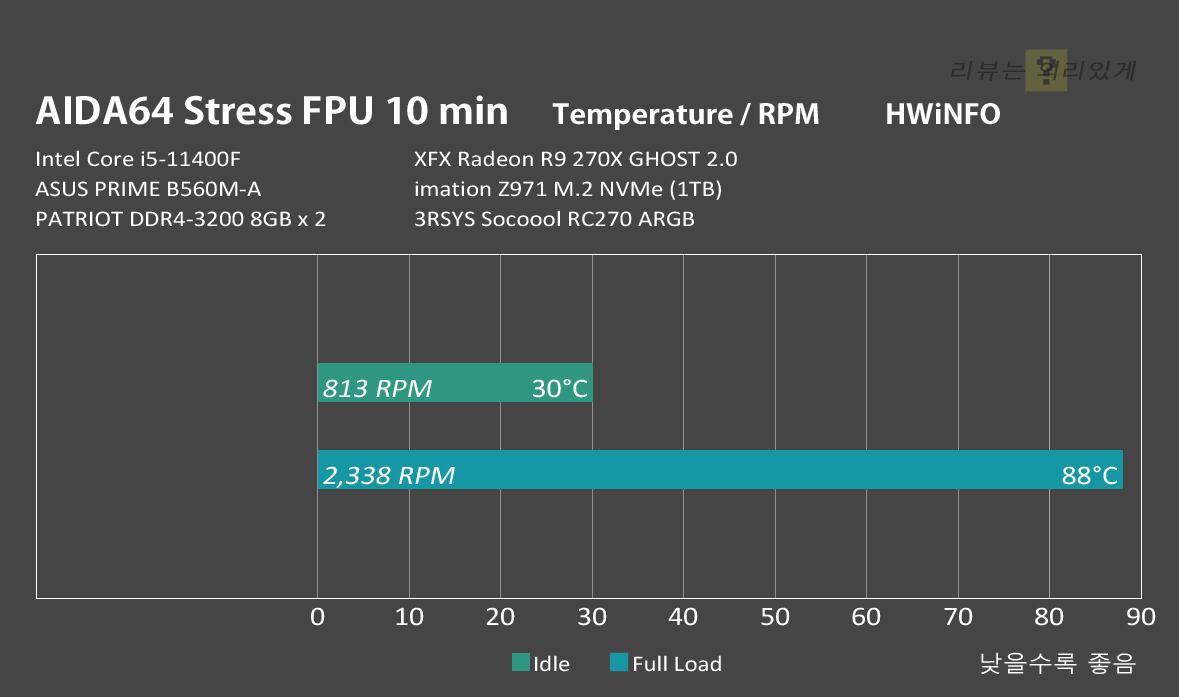 온도 및 팬 RPM 측정은 AIDA64의 항목 중 Stress FPU만 선택하여 약 10분간 진행하였습니다. 이와 함께 유휴 및 풀로드 상태 확인은 HWiNFO를 사용해 측정하였습니다.