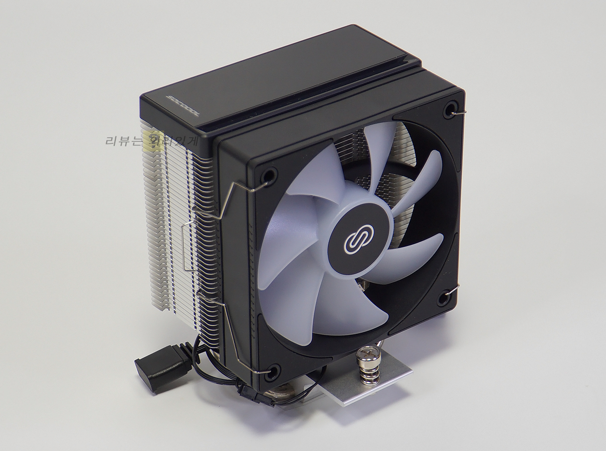 팬 고정은 다른 타워형 공랭 쿨러와 마찬가지로 클립을 사용하고 있으며 히트파이프는 히트싱크를 관통하는 방식을 채택하였습니다. 또한 뒤로 밀려난 듯한 디자인은 제품 조립 시 팬을 분리한 후 다시 장착하는 번거로운 과정을 하지 않게 하고 있습니다.