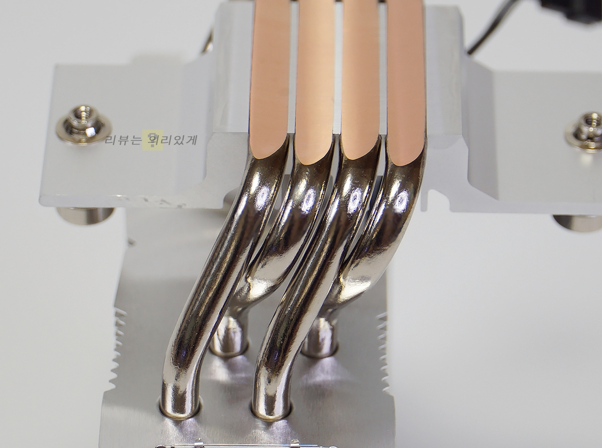 이와 같은 방식은 저가형에서 주로 사용되는 형태로 이보다 좀 더 가격대가 높아지면 히트파이프가 서로 완전히 붙어 있는 형태로 사용됩니다. 성능만 본다면 간격 없이 사용되는 것이 좋으나 제조 단가나 가격을 생각하면 어쩔 수 없습니다. 또한 히트파이프와 방열판이 얼마나 틈새 없이 잘 부착되어 있는지도 함께 확인하면 좋습니다.