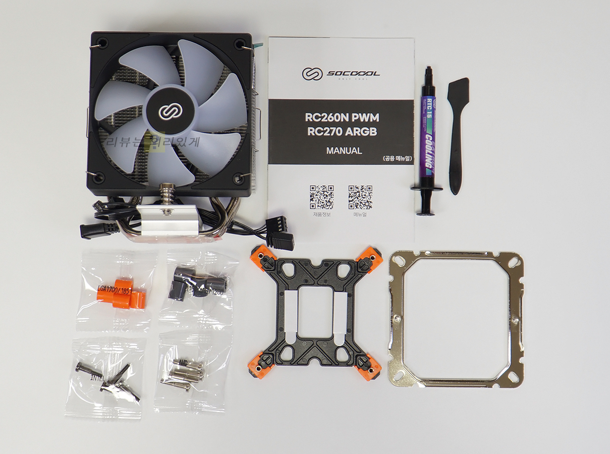 제품 조립 방식은 인텔 LGA1200 소켓을 기준으로 하였습니다. 인텔과 AMD의 소켓을 모두 지원하고 있으나 부품의 수가 많지 않아 복잡하지 않으며 일부는 공용 부품을 사용하고 있는 등 가능한 부품의 수를 줄이려 한 노력이 보입니다. 다만 가격대를 감안하면 어쩔 수 없으나 AMD CPU가 쿨러와 함께 떨어지는 '무 뽑기' 현상을 방지하기 위한 AM4 세이프티 가드가 제공되지는 않습니다.
