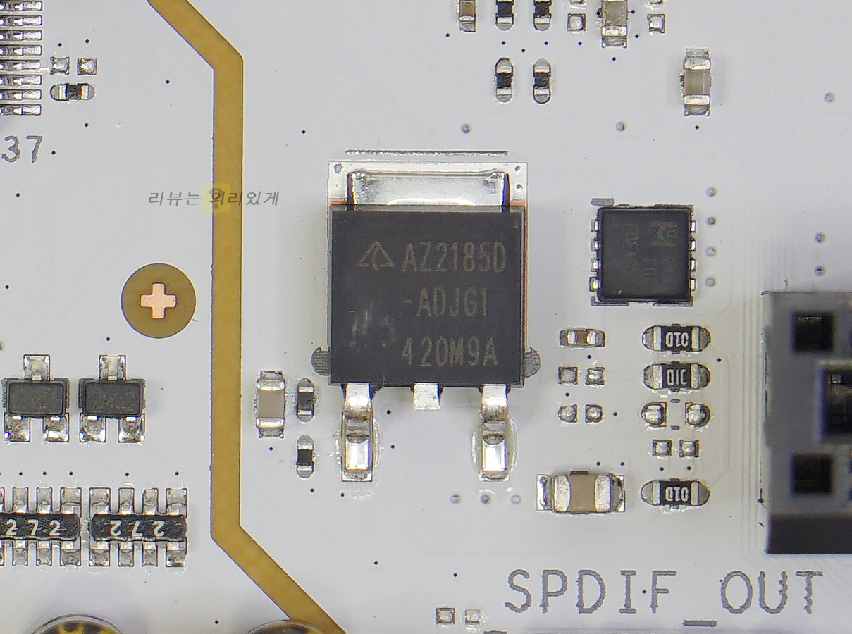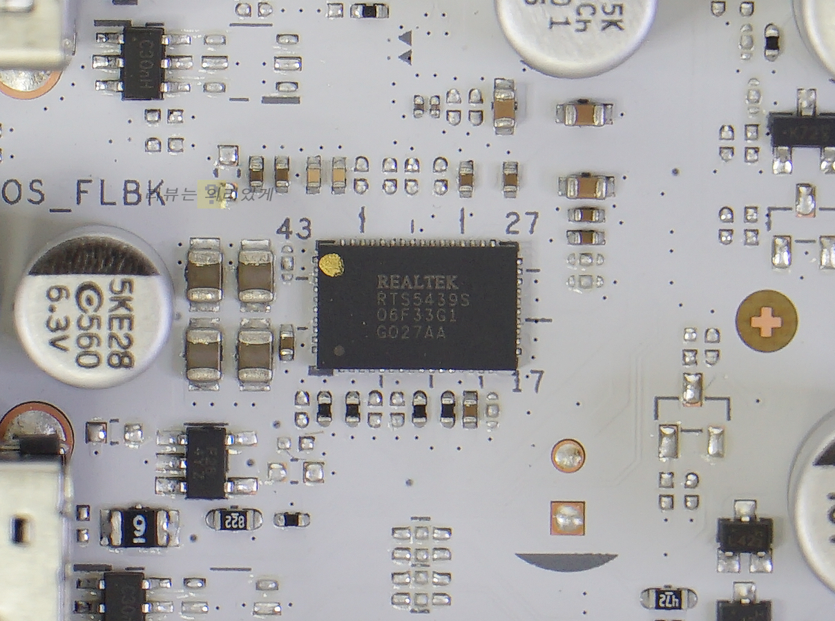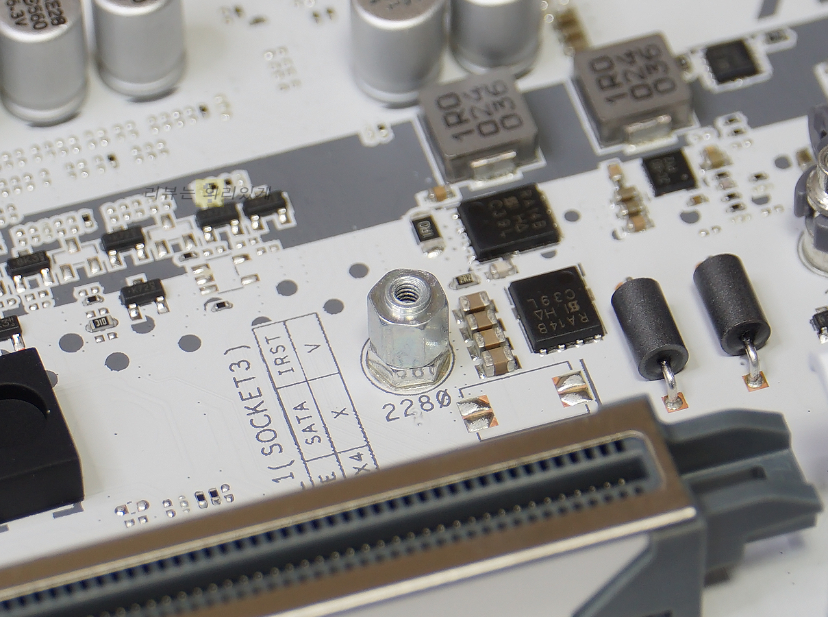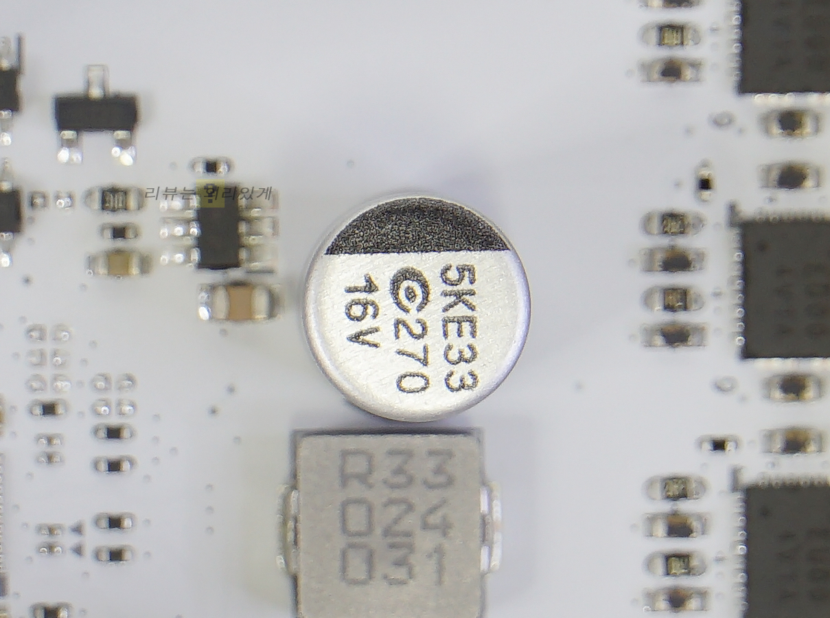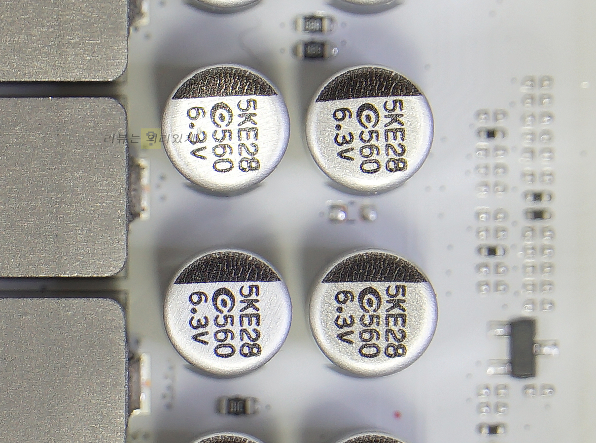 5KE33 270 16V와 5KE28 560 6.3V 캐패시터가 사용되었습니다. 각각 270µF, 16V 정격 전압과 560µF(마이크로패럿), 6.3V 정격 전압을 가진 알루미늄 폴리머 콘덴서입니다. CPU 전원부 모스펫은 Alpha & Omega AOZ53071QI 80 A Dr.MOS이 사용되었습니다.