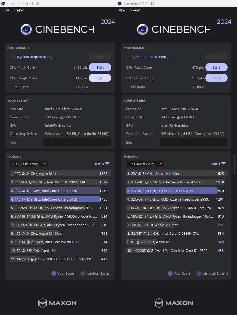 CPU-Z와 시네벤치 2024에서 각각 싱글 및 멀티 코어 성능을 비교 하였습니다. 두 벤치마크 모두 약간의 성능 향상이 있다는 것을 알 수 있었습니다. 물론 사용자가 임의로 오버클럭을 진행한다면 좀 더 높은 점수를 기대해 볼 수도 있을 것입니다.