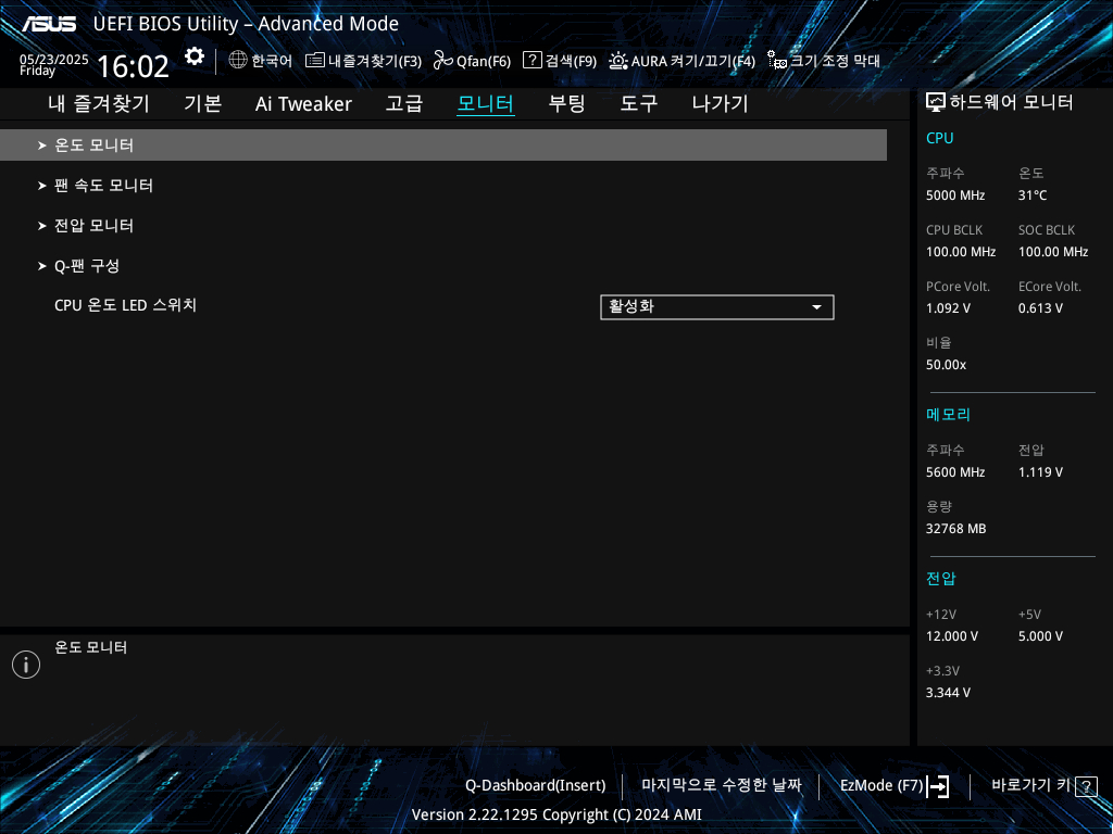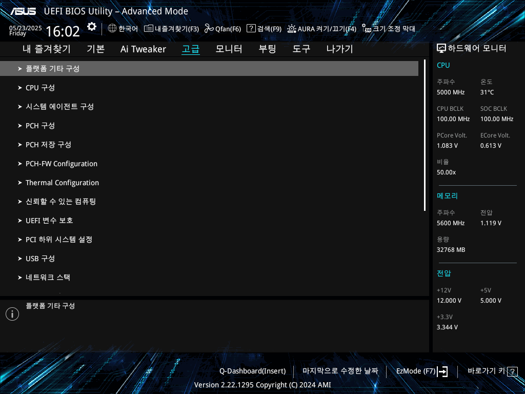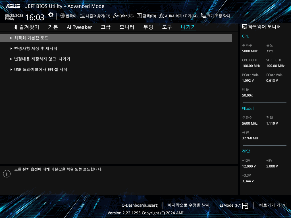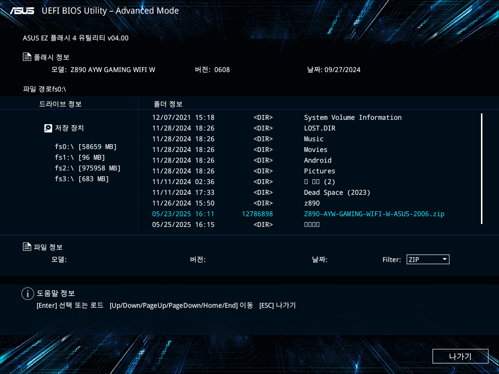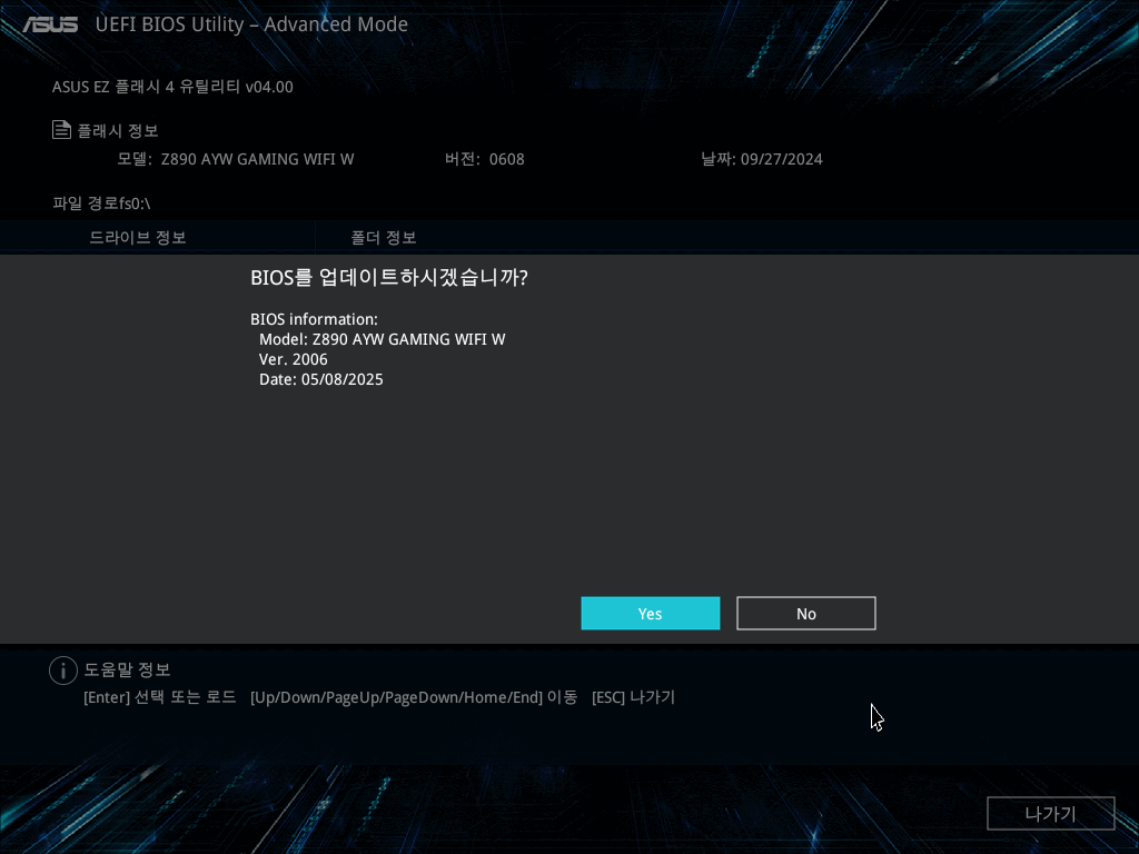 현재 사용 중인 바이오스 버전은 24년 9월에 출시되어 오래되었습니다. 에이수스 홈페이지에서 해당 메인보드를 검색하여 최신 바이오스를 다운로드한 다음 USB 메모리카드에 압축파일 형태로 담아놓은 다음 EZ 플래시 기능을 활용해 업데이트를 진행할 수 있습니다.