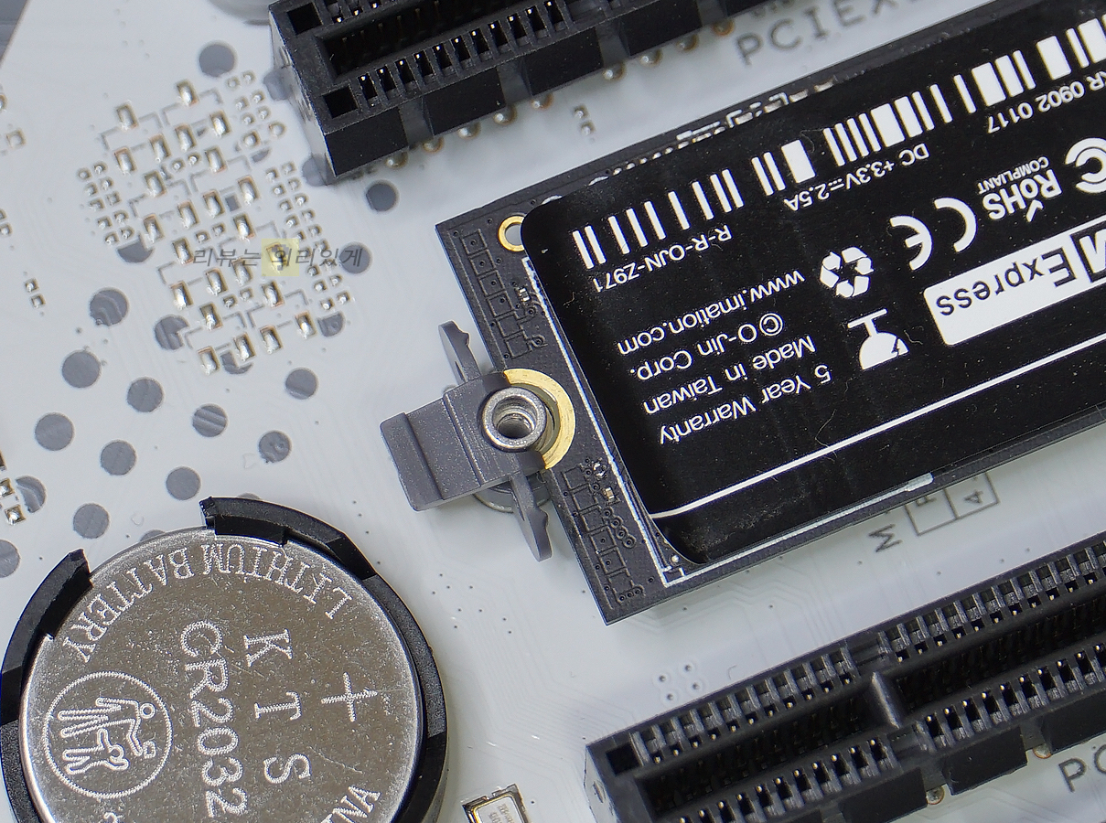 이와 함께 M.2 슬롯에는 Q-래치를 추가하여 M.2 SSD를 보다 쉽게 장착하고 고정시킬 수 있게 하였습니다. 다만 첫 번째 슬롯의 경우 많이 사용되는 2280 위치에 부착되어 있지 않아 기존 방식을 사용해야 하는 번거로움이 있습니다.