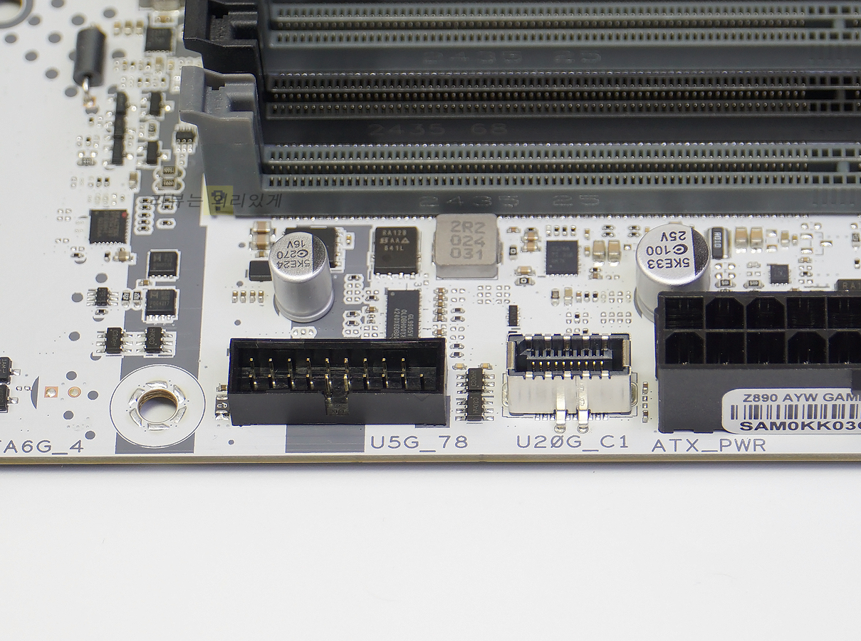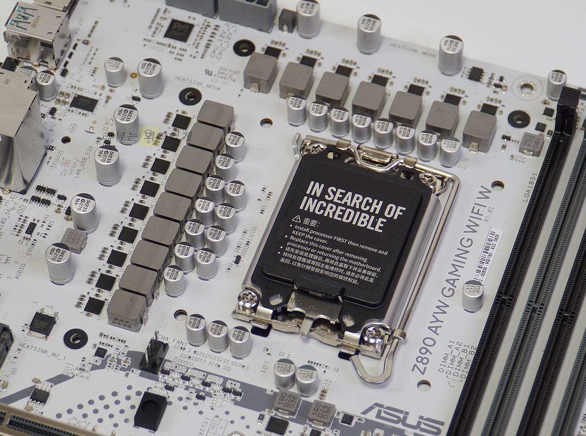 우측 하단에는 인텔 Z890 칩셋이 부착되어 있습니다. 방열판을 제거하면 확인할 수 있습니다.