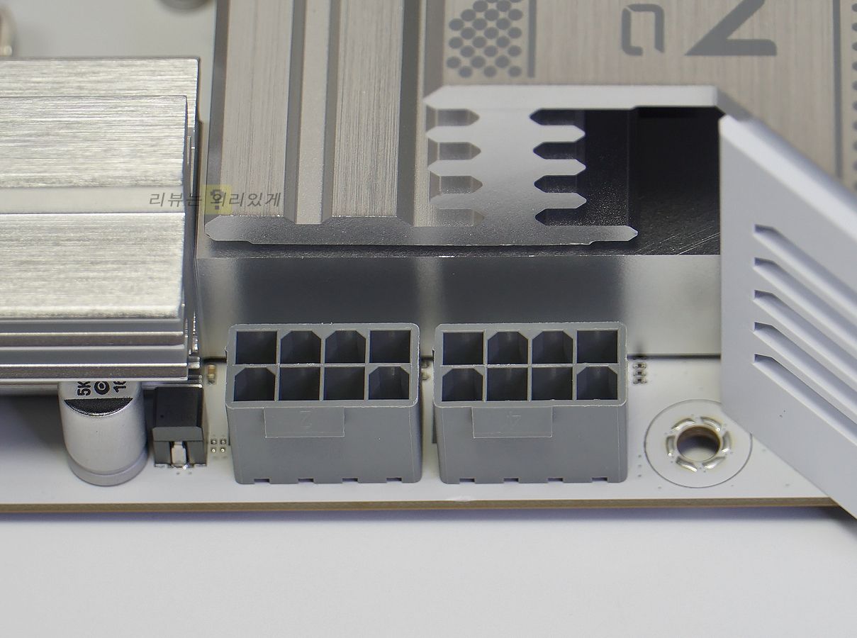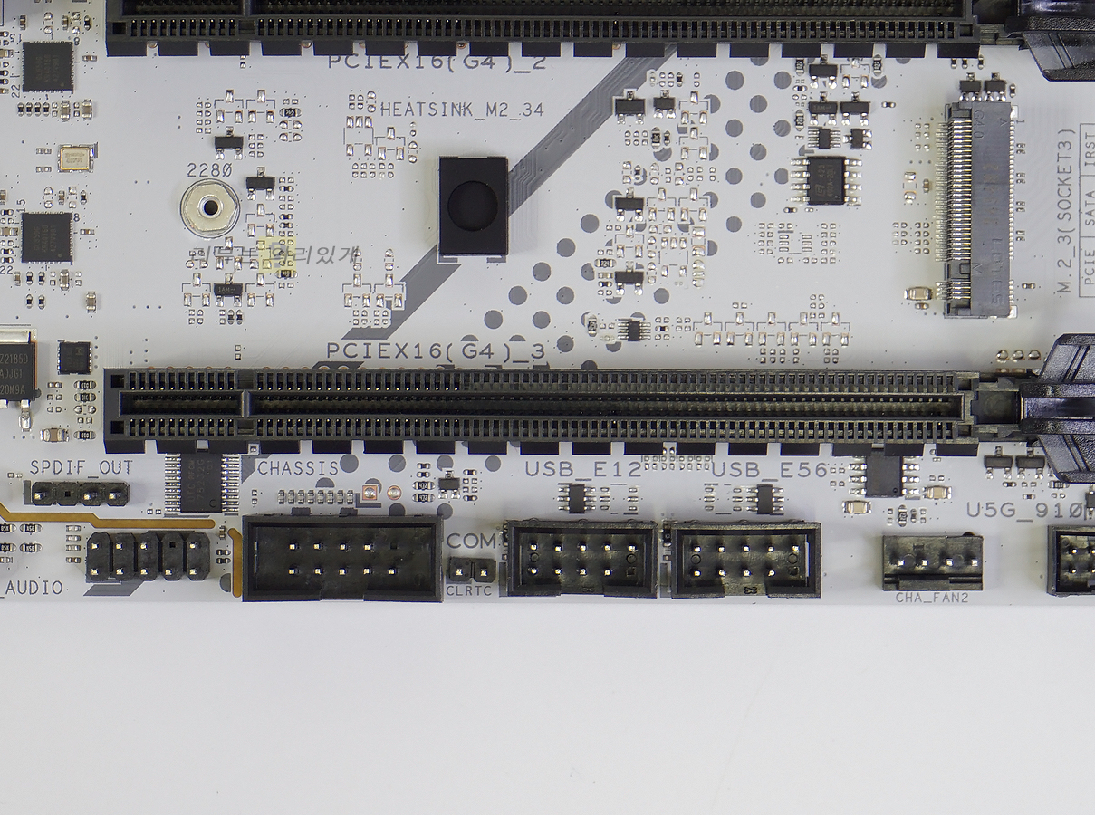 화이트 색상의 PCB와 금속 색상의 히트싱크가 사용되어 비슷한 계열이지만 완전히 같은 색상은 아닙니다. 하지만 밝은 계열의 색상을 사용하여 흔히 말하는 '화이트 감성'에 적합한 편이라 할 수 있습니다. 전원부 전체를 덮고 있는 히트싱크와 플라스틱 소재의 I/O 포트 커버가 사용되었으며 M.2 SSD 방열판까지 추가되었습니다.