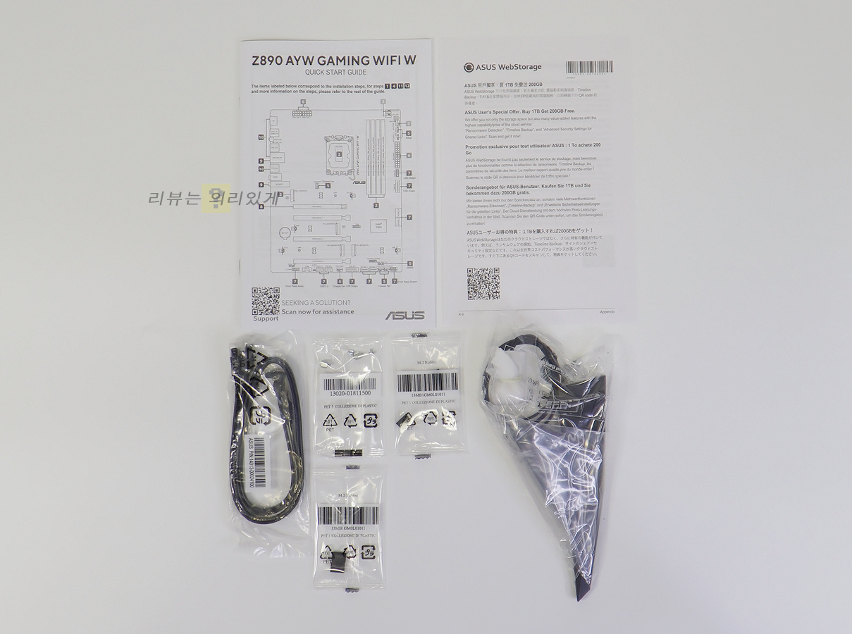 빠른 시작 가이드, 에이수스 웹 가이드 안내서, 이동형 와이파이 안테나, M.2 러버 및 나사 패키지, SATA 케이블이 제공됩니다.