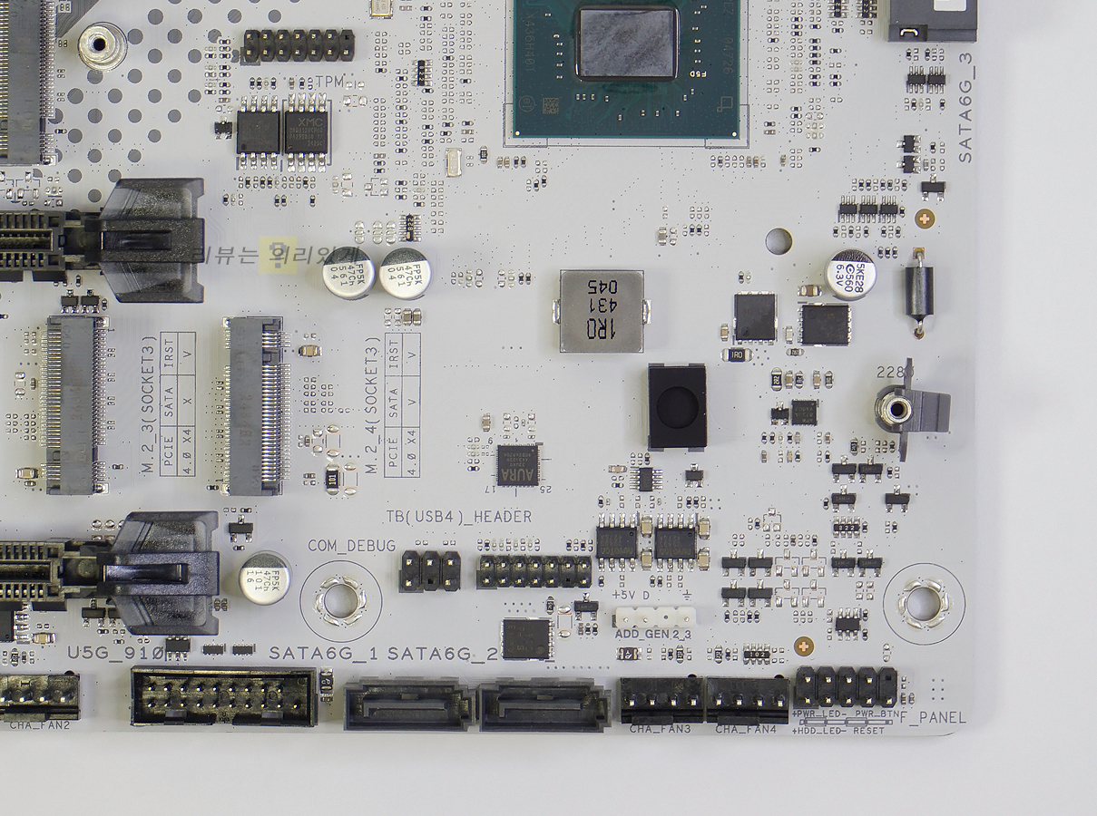 하단과 측면에는 팬 포트와 USB 확장 포트, SATA 포트, 프론트 패널 커넥터를 확인할 수 있습니다. 다만 아쉽게도 썬더볼트는 지원하지 않는데 대신 썬더볼트 헤더를 제공하고 있어 별도의 PCIe 카드를 장착하여 활용할 수 있습니다.
