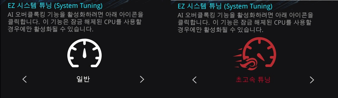 에이수스 메인보드에는 바이오스 클릭으로 변경시킬 수 있는 EZ 시스템 튜닝 기능을 제공하고 있습니다. 일반, 고속 튜닝, 초고속 튜닝으로 총 3가지 모드 변환이 가능한데 사용자가 임의로 커스텀 오버클럭을 하는 것에 비할 바는 아니나 간편하게 성능 향상을 시킬 수 있다는 특징이 있습니다.