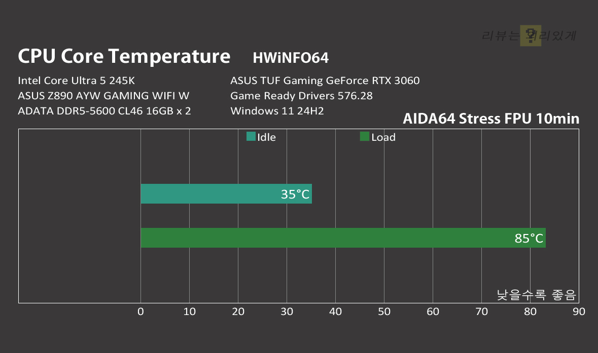 유휴 상태에서 약 35도로 확인되었으며 풀로드에서는 85도로 확인되었습니다. 사용된 쿨러가 비교적 저렴한 모델이라는 것과 AIDA64 벤치마크가 CPU 부하가 높다는 것을 생각하면 실제 사용에서는 이보다는 낮게 나올 것으로 생각됩니다.