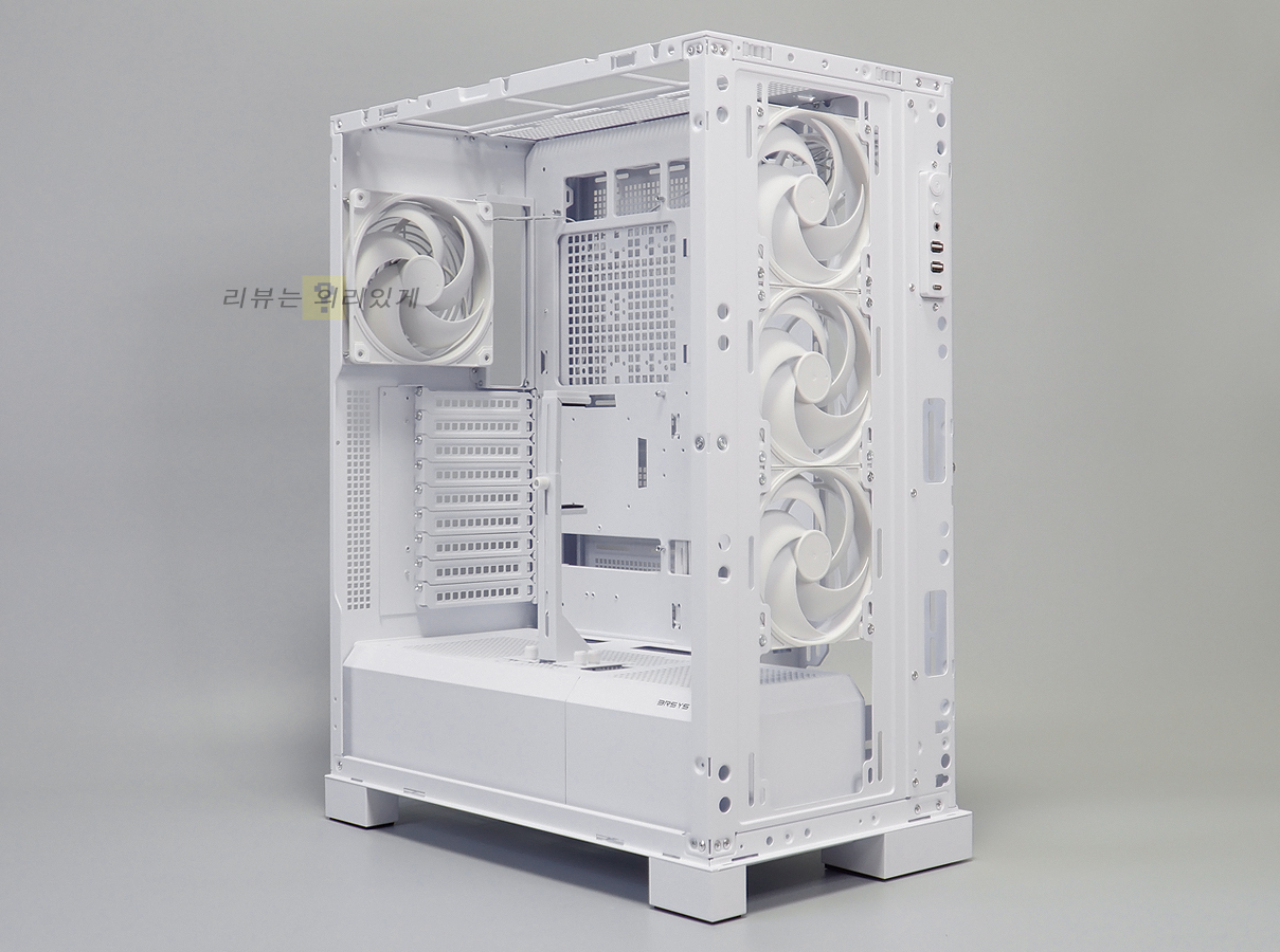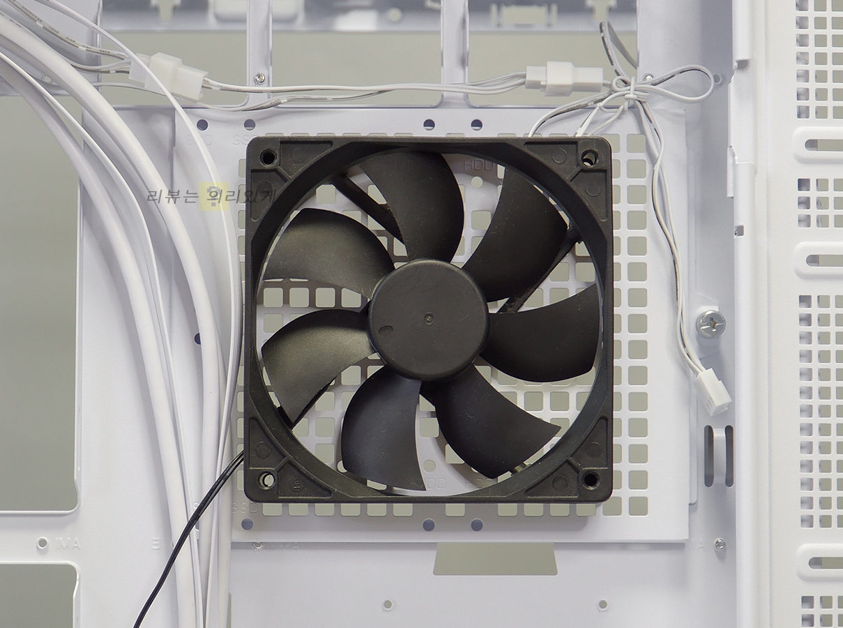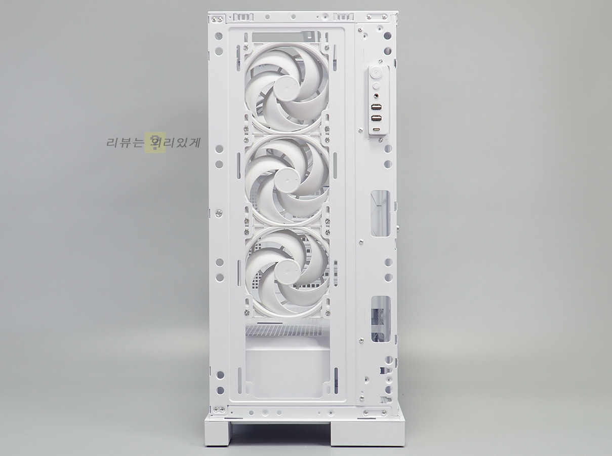 전면에는 120mm non-LED 팬이 3개 장착되며 하단에 가이드를 분리하면 1개 더 추가 장착이 가능합니다.