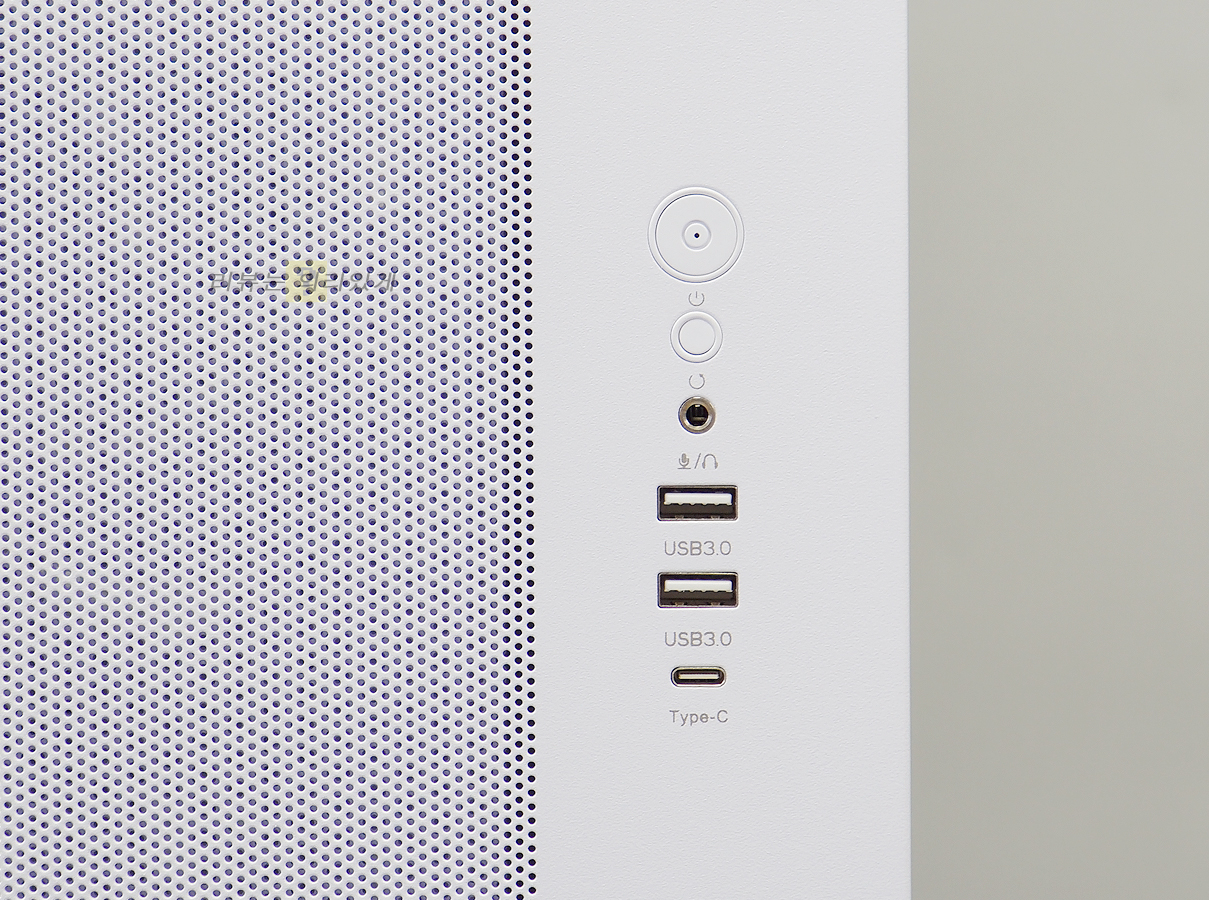 I/O 포트는 전면에 위치해 있으며 전원, 리셋, 마이크/오디오 포트, USB 3.0, USB Type C 포트가 부착되어 있습니다.
