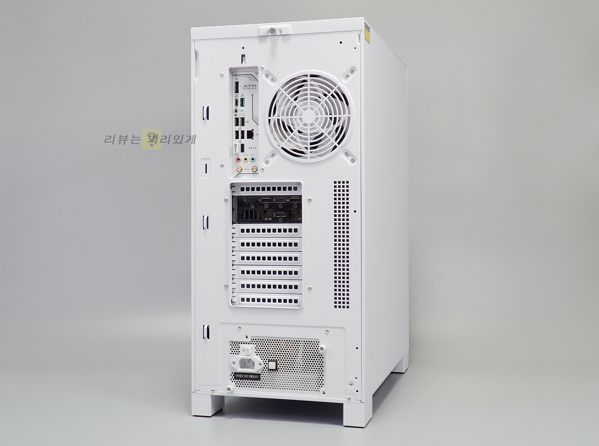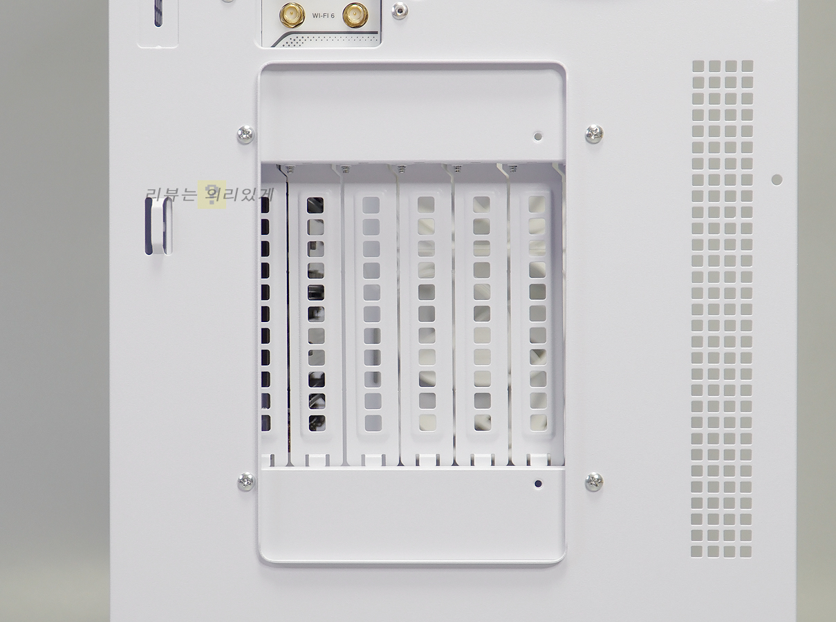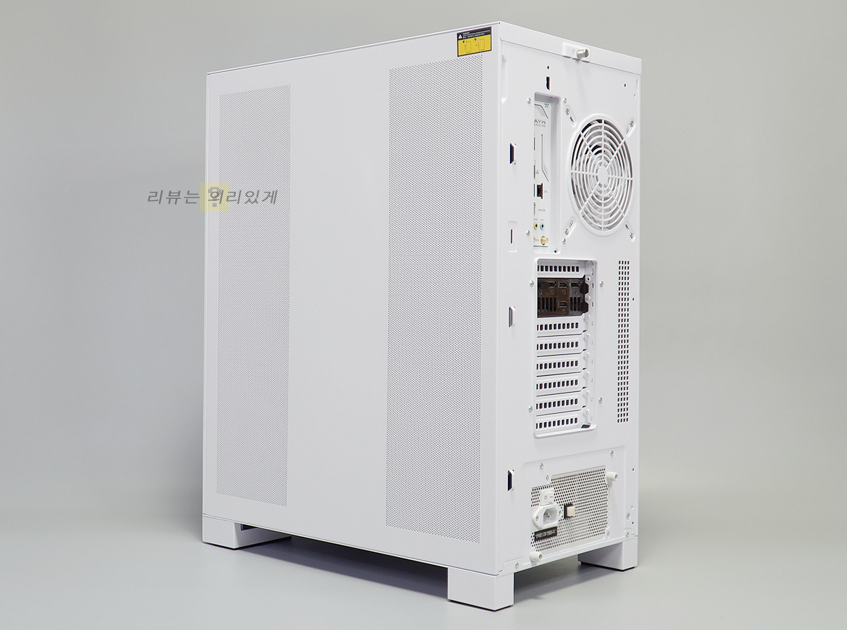 후면에는 팬 그릴이 부착된 후면 팬과 타공 구조를 추가한 PCI 슬롯을 확인할 수 있습니다.