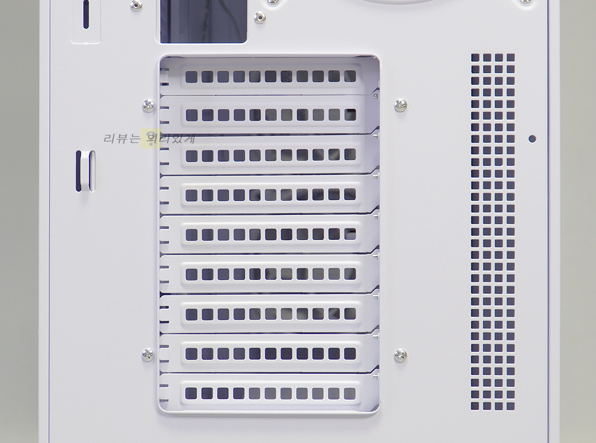 특이하게 PCI 슬롯이 나사로 고정되어 있어 분리하였더니 회전이 되는 것을 확인하였습니다. 이는 그래픽카드 수직 장착을 지원하는 것으로 볼 수 있는데, 실제로 측면 패널이 메쉬 구조 없이 완전히 막혀 있는 것과 상품 정보에서 따로 언급이 없는 것, 그리고 파워 서플라이 체임버에 장착을 위한 나사 홀이 없는 것으로 보아 실제 장착은 지원하지 않는 것으로 보입니다.