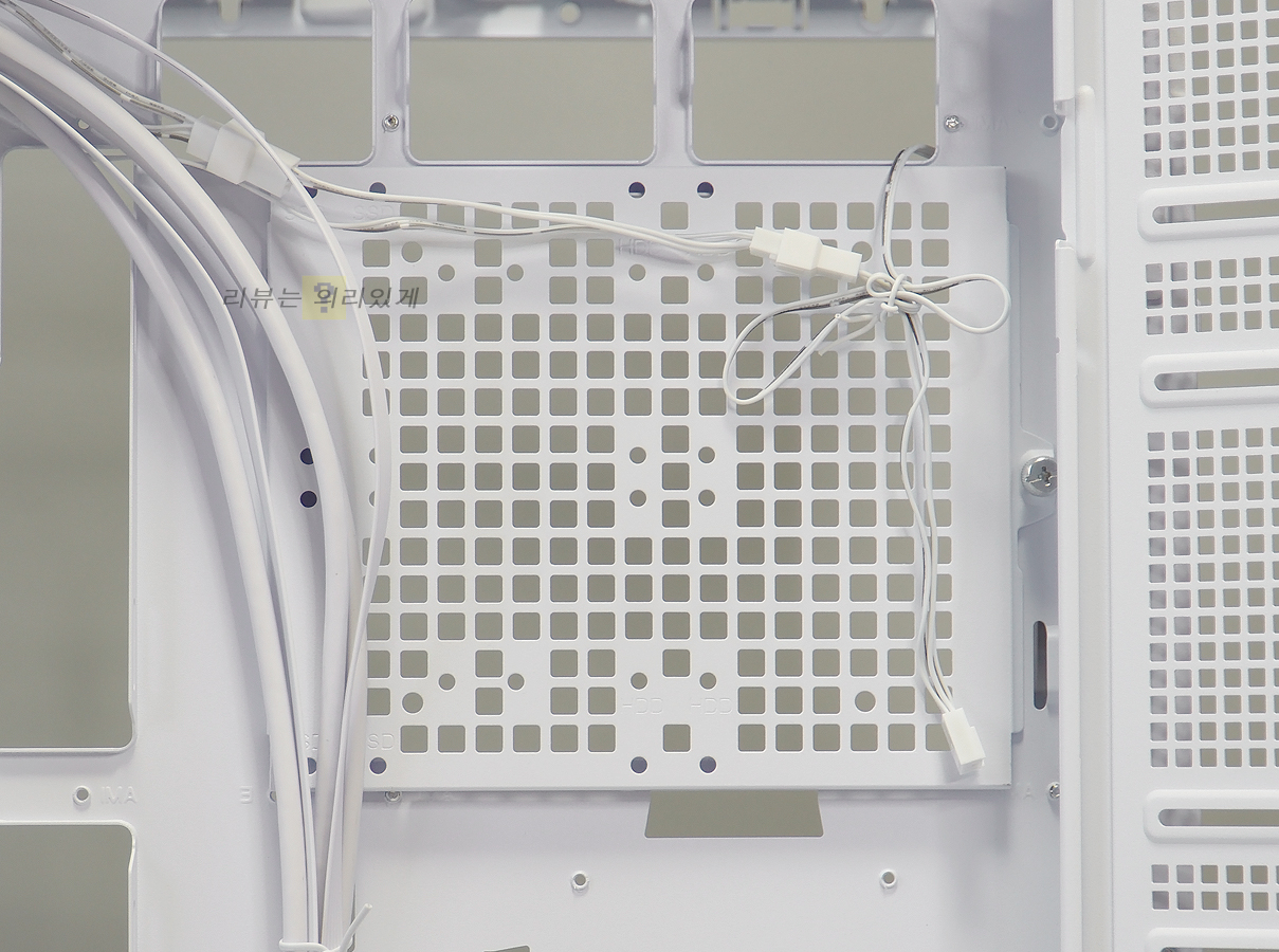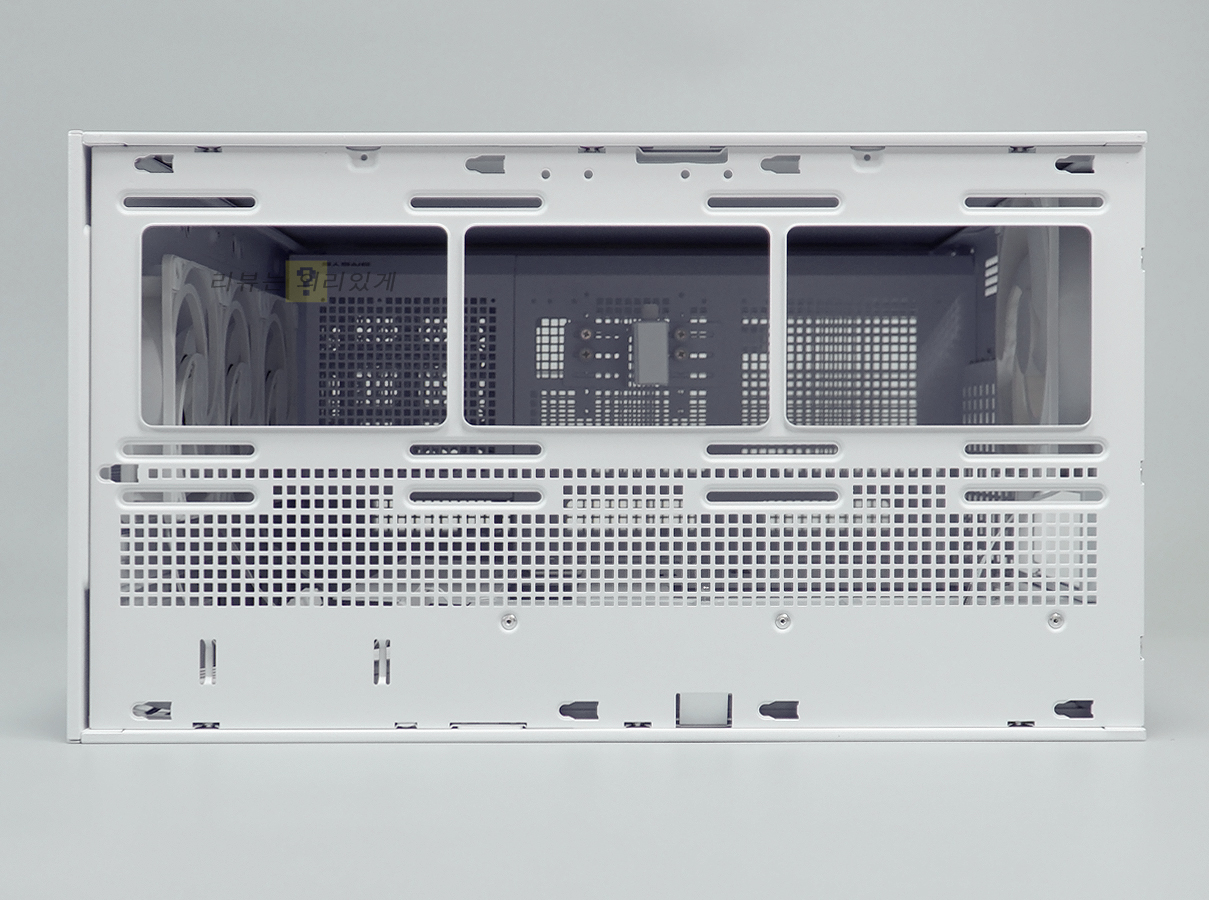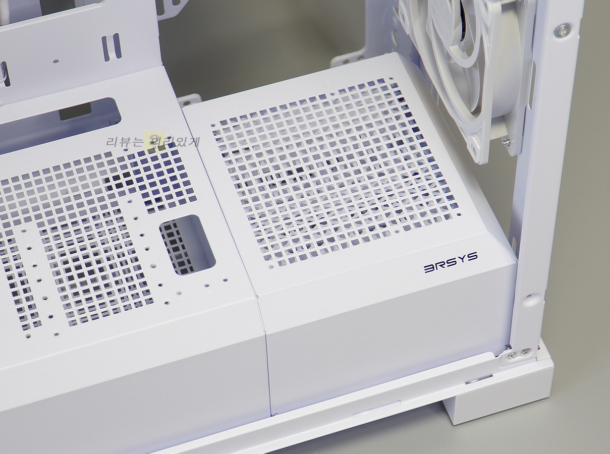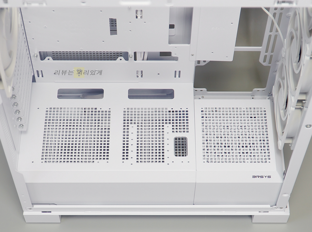 파워 서플라이 체임버에는 쿨링을 위한 타공망구조가 추가되었으며 저장 장치 가이드는 분리가 가능한 구조로 되어 있습니다. 이는 전면 수랭 쿨러 장착을 고려한 것으로 보이는데 이 때문인지 가이드는 하단 팬을 분리하지 않으면 탈거할 수 없습니다.