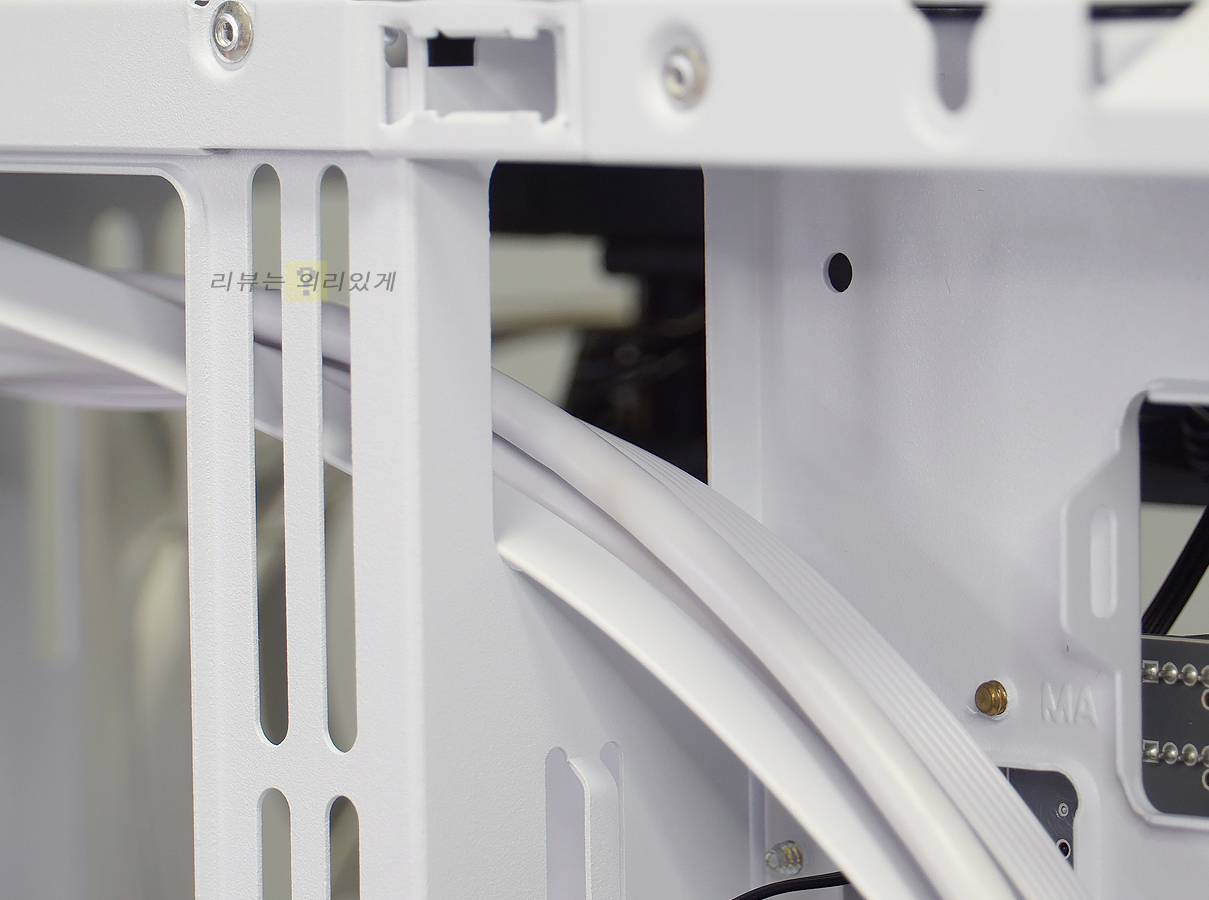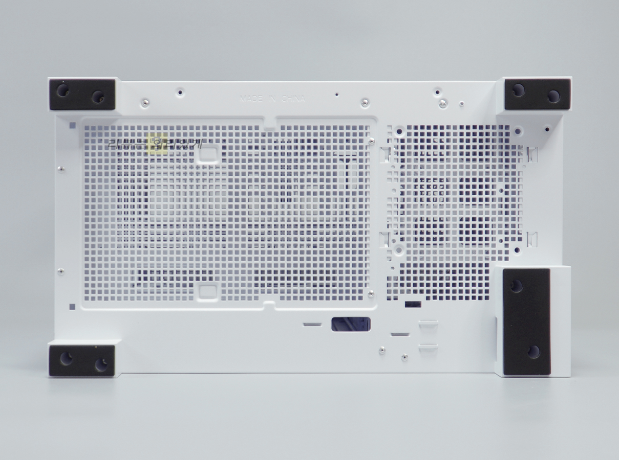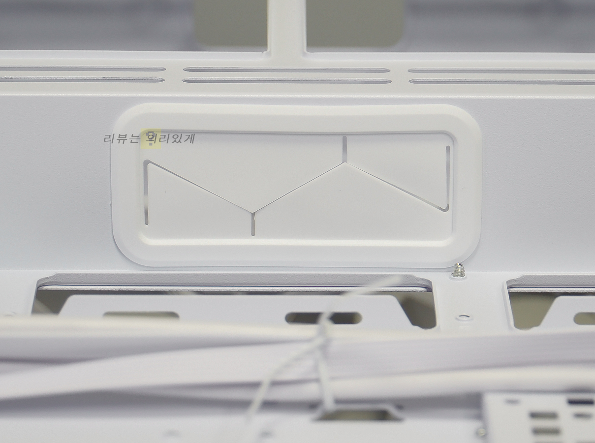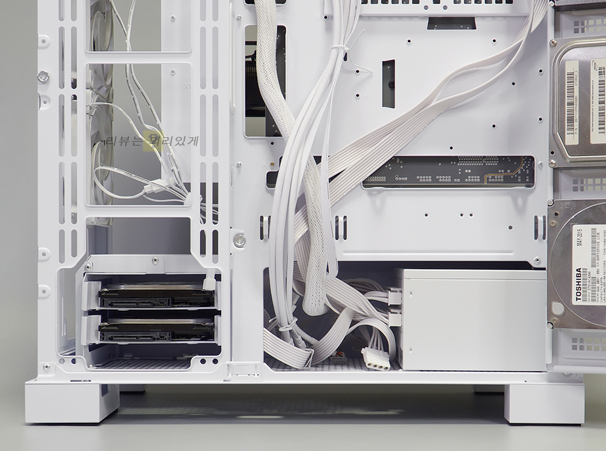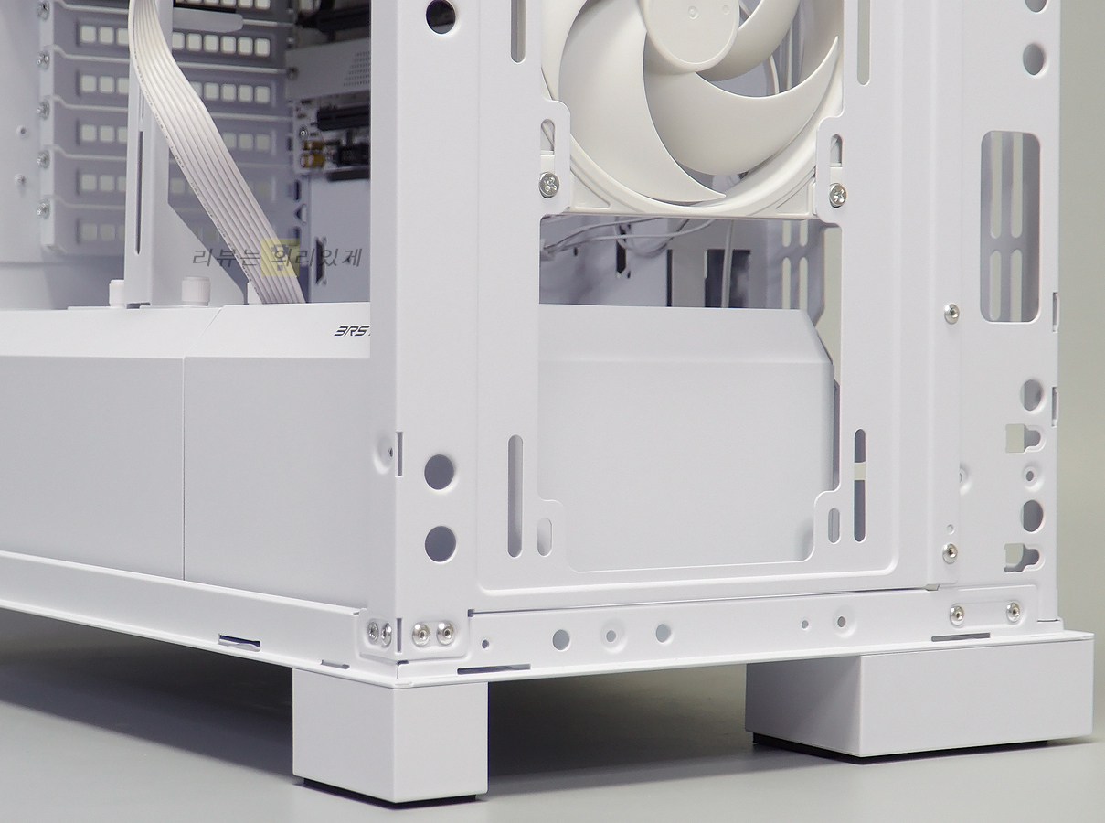 파워 서플라이 체임버에는 쿨링을 위한 타공망구조가 추가되었으며 저장 장치 가이드는 분리가 가능한 구조로 되어 있습니다. 이는 전면 수랭 쿨러 장착을 고려한 것으로 보이는데 이 때문인지 가이드는 하단 팬을 분리하지 않으면 탈거할 수 없습니다.