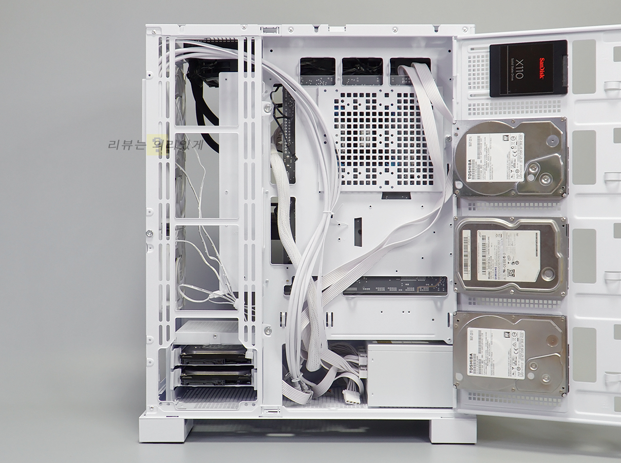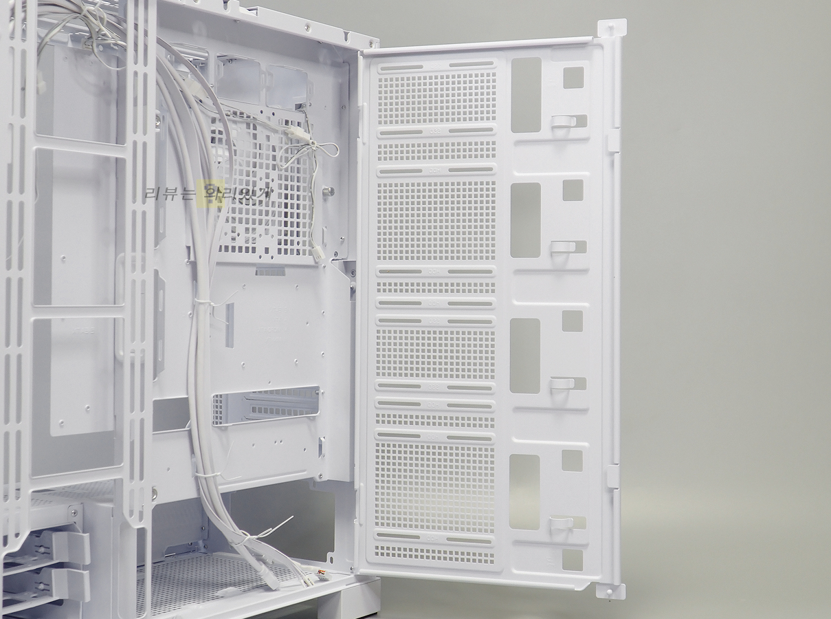 저장 장치는 체임버에도 장착이 가능하지만 측면 스토리지 확장 도어 방식을 사용해 추가 장착을 지원합니다. 스윙 도어 방식으로 자석으로 부착시키는 방식을 사용하기 때문에 분리와 결합이 편리합니다. 또한 케이블 선정리를 고려하여 홀더를 각 장착 위치에 추가한 것을 알 수 있습니다.