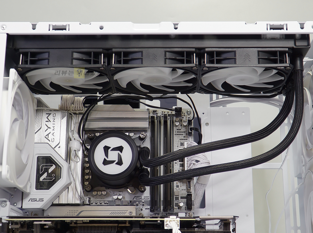 상단에는 360mm 수랭 쿨러뿐만 아니라 최대 480mm 라디에이터 장착을 지원하고 있습니다. 메인보드 보조 전원의 경우 라디에이터와의 충분한 여유 공간이 만들어져 장착이 불편하지 않았습니다.
