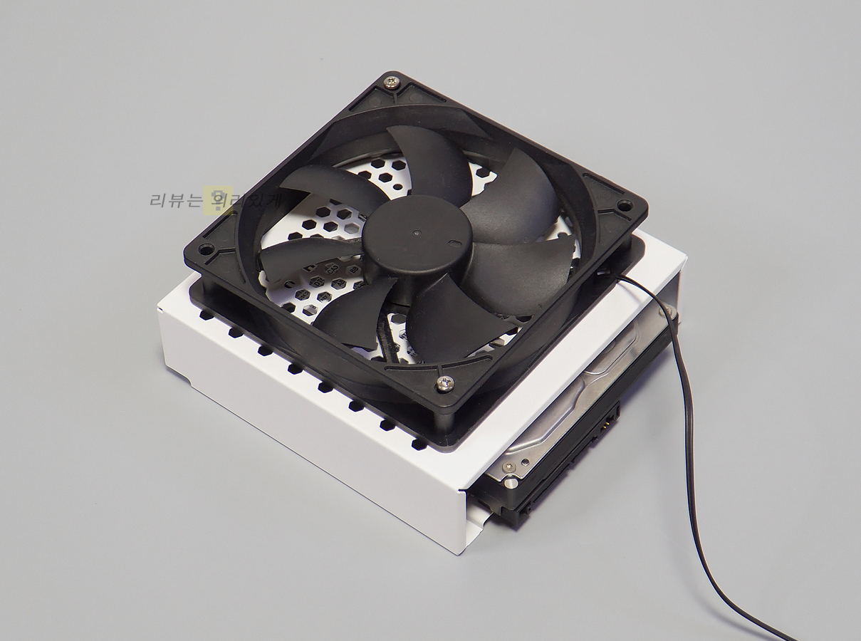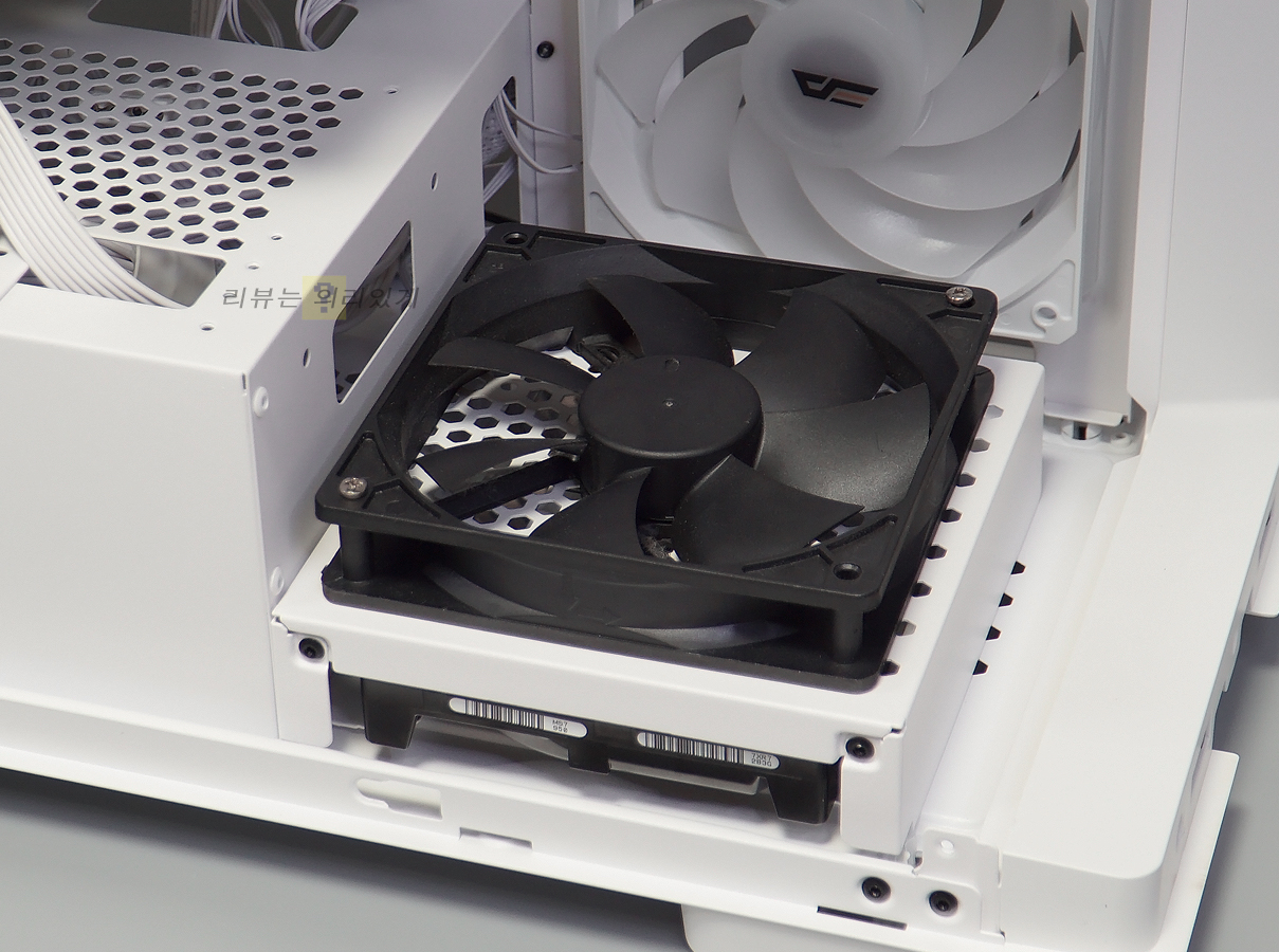 저장 장치 가이드는 파워 서플라이 체임버와 분리된 형태로 측면에서 이를 분리할 수 있게 하였습니다. 다만 앞서 말한 바와 같이 바닥에 나사를 분리해야 하며 HDD 1개, SSD 1개 또는 HDD 1개, 120mm 팬 1개를 장착할 수 있습니다. HDD 2개를 장착할 수도 있지만 측면 팬과의 간섭 문제로 인해 케이블 연결이 되지 않습니다.