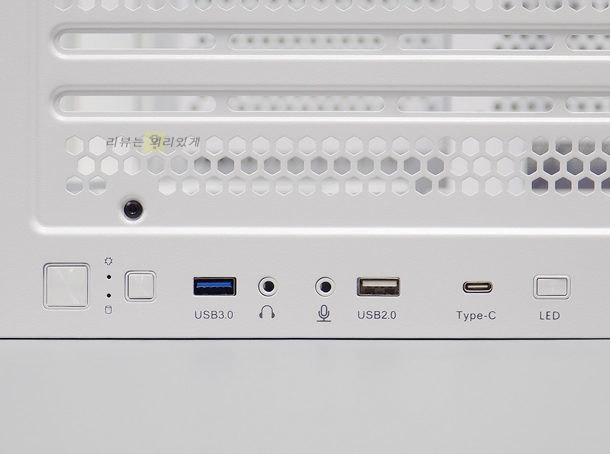 상단에는 자석식 먼지 필터를 제공하고 있으며 수랭 쿨러 또는 쿨링팬을 장착할 수 있습니다. I/O 포트는 상단에 위치해 있으며 전원, 리셋, USB 3.0, 헤드폰/마이크 포트, USB 2.0, USB Type C, LED 컨트롤 버튼이 제공됩니다. LED 컨트롤 버튼은 허브에 장착해야 하며 이를 사용하고 싶지 않다면 ARGB 5V 3핀을 장착하여 메인보드에서 소프트웨어를 사용해 조명 효과를 제어하면 됩니다.