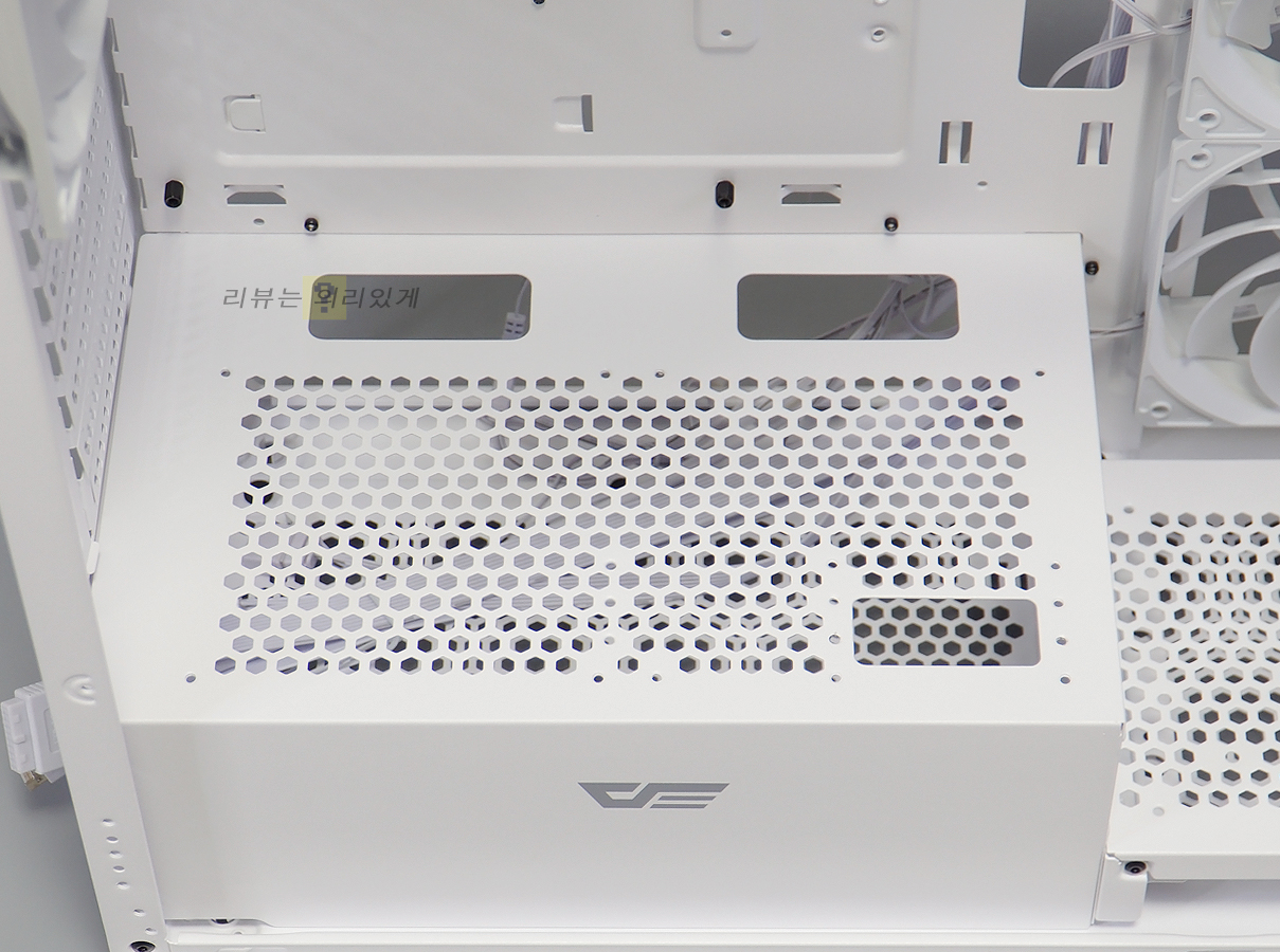 파워 서플라이 체임버에는 팬 장착을 위한 공간과 내부 쿨링을 위해 벌집형 타공 구조를 추가하였습니다. 그래픽카드 보조 전원과 내부 케이블 연결을 위해 선정리 홀을 추가하였습니다.