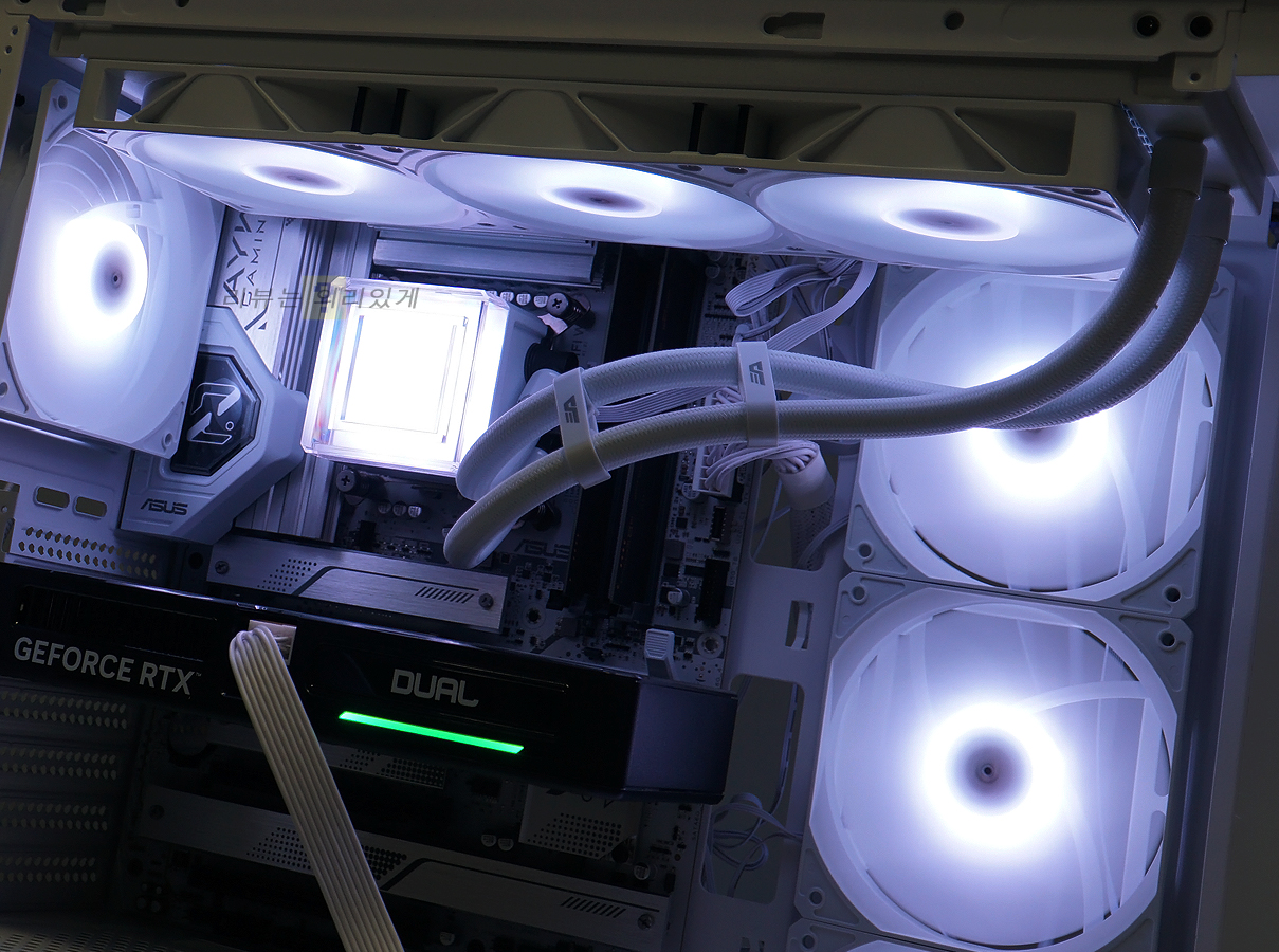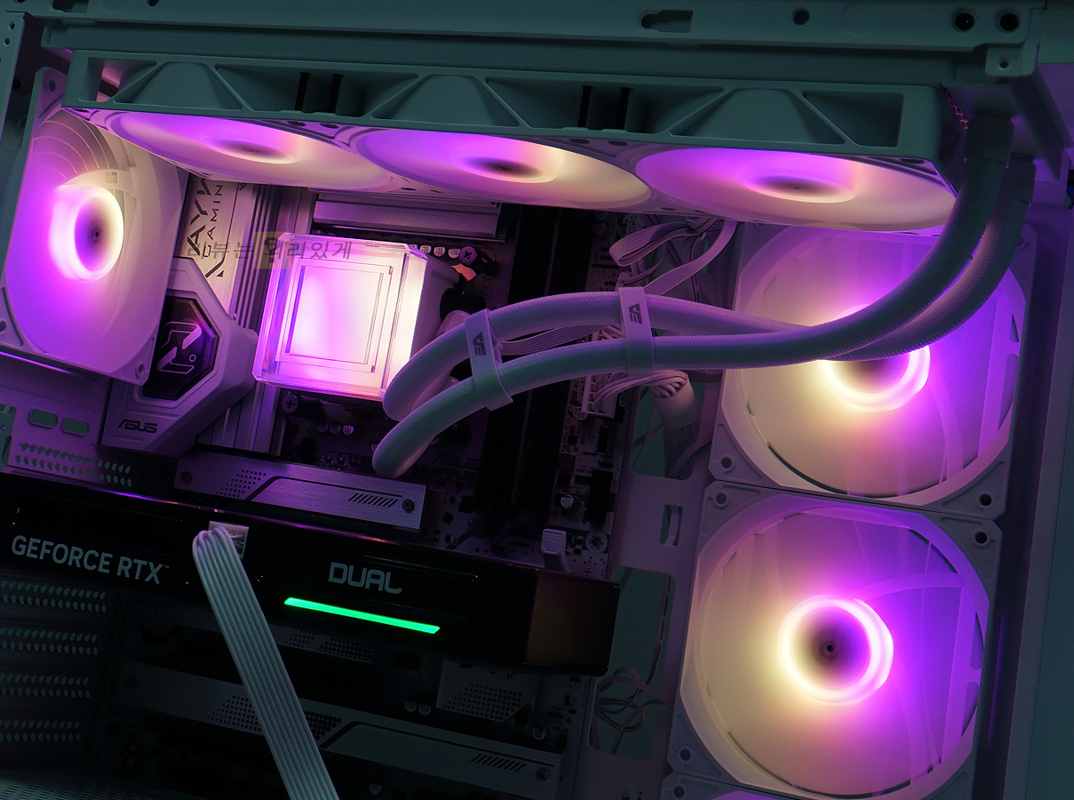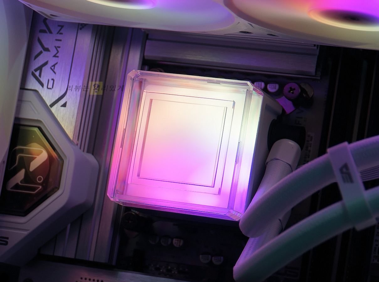 메인보드 제조사에서 제공하는 조명 제어 프로그램을 사용해 모드와 단색 RGB 효과 등을 제어할 수 있습니다. 사용 중인 케이스의 팬이 ARGB 방식이라면 수랭 쿨러와 함께 동일한 효과를 제어할 수 있기 일체감 있는 모습을 감상할 수 있습니다. 조명 효과는 쿨링팬과 펌프 유닛에서 점등되는데 펌프 유닛의 투명 플라스틱 덕분에 무드등 같은 느낌도 확인할 수 있습니다.