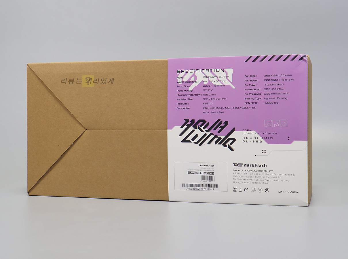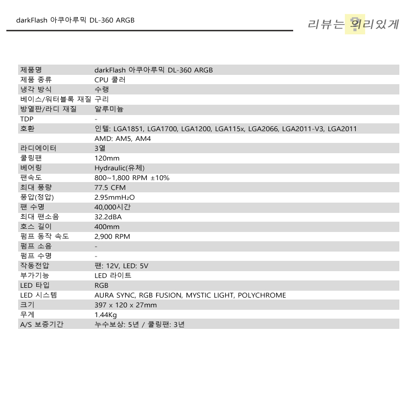darkFlash 아쿠아루믹 DL-360 ARGB에서 주목해야 할 점은 많지만 무엇보다 누수 보상 5년을 눈여겨봐야 합니다. 가격대가 저렴하게 되면 원가 절감을 하지 않을 경우 보증 서비스 기간을 줄이거나 혜택을 줄이는 방식으로 이를 대처하는데 저렴한 가격의 수랭 쿨러임에도 누수 보상 기간이 상당히 긴 편입니다. 쿨러의 경우 보증 3년이 제공되는데 문제가 발생하더라도 안심하고 사용할 수 있을 것입니다.